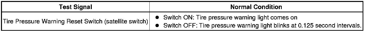 * During Test Mode, the system is not initialized by pushing the tire pressure warning reset switch (satellite switch). The circuit of the tire pressure warning reset switch (satellite switch) can be inspected during this mode.