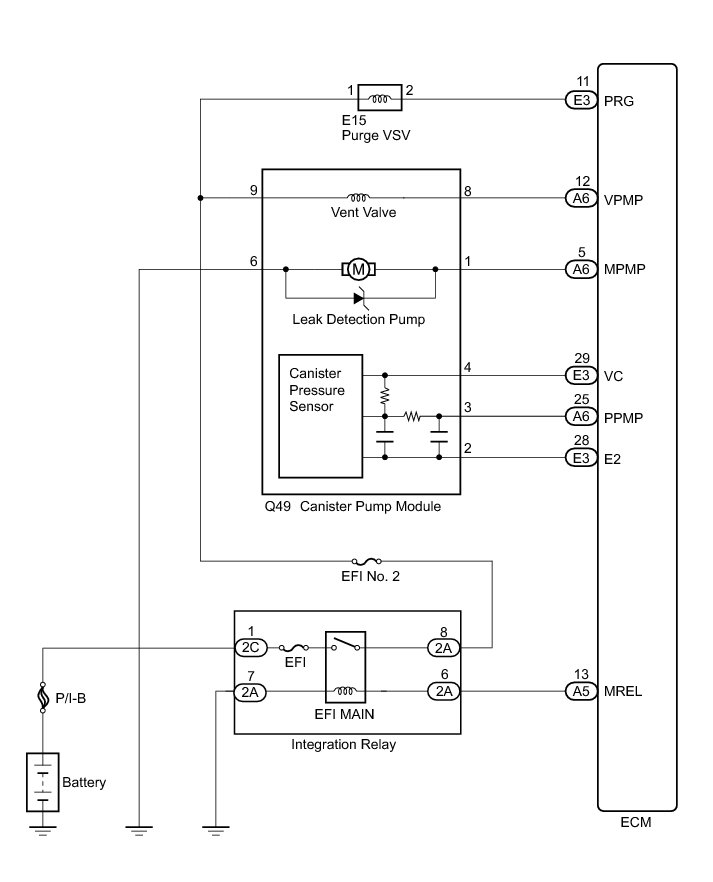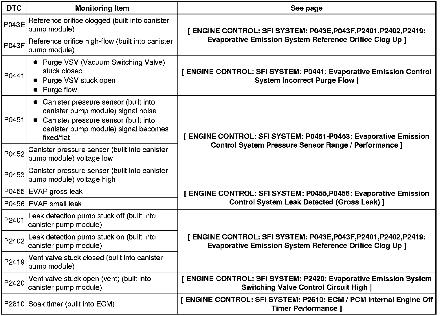 The leak detection pump creates negative pressure (vacuum) in the EVAP system and the pressure is measured. Finally, the ECM monitors for leaks from the EVAP system, and malfunctions in both the canister pump module and purge VSV based on the EVAP pressure.