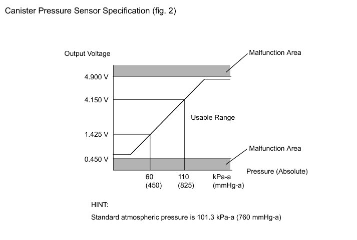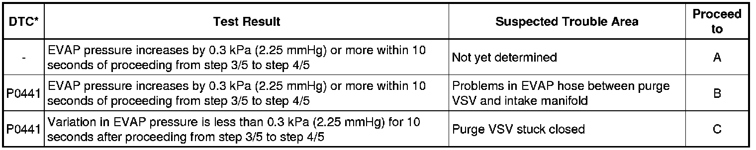 The vent valve is turned off (open) and the EVAP pressure is measured. If the variation in the pressure is less than 0.4 kPa (3 mmHg), the ECM interprets this as the purge VSV being stuck closed, illuminates the MIL and sets DTC P0441 (2 trip detection logic).