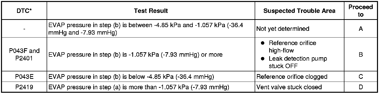 If the reference pressure difference between the first and second checks is greater than the specification, all the DTCs relating to the reference pressure (P043E, P043F, P2401, P2402 and P2419) are stored.