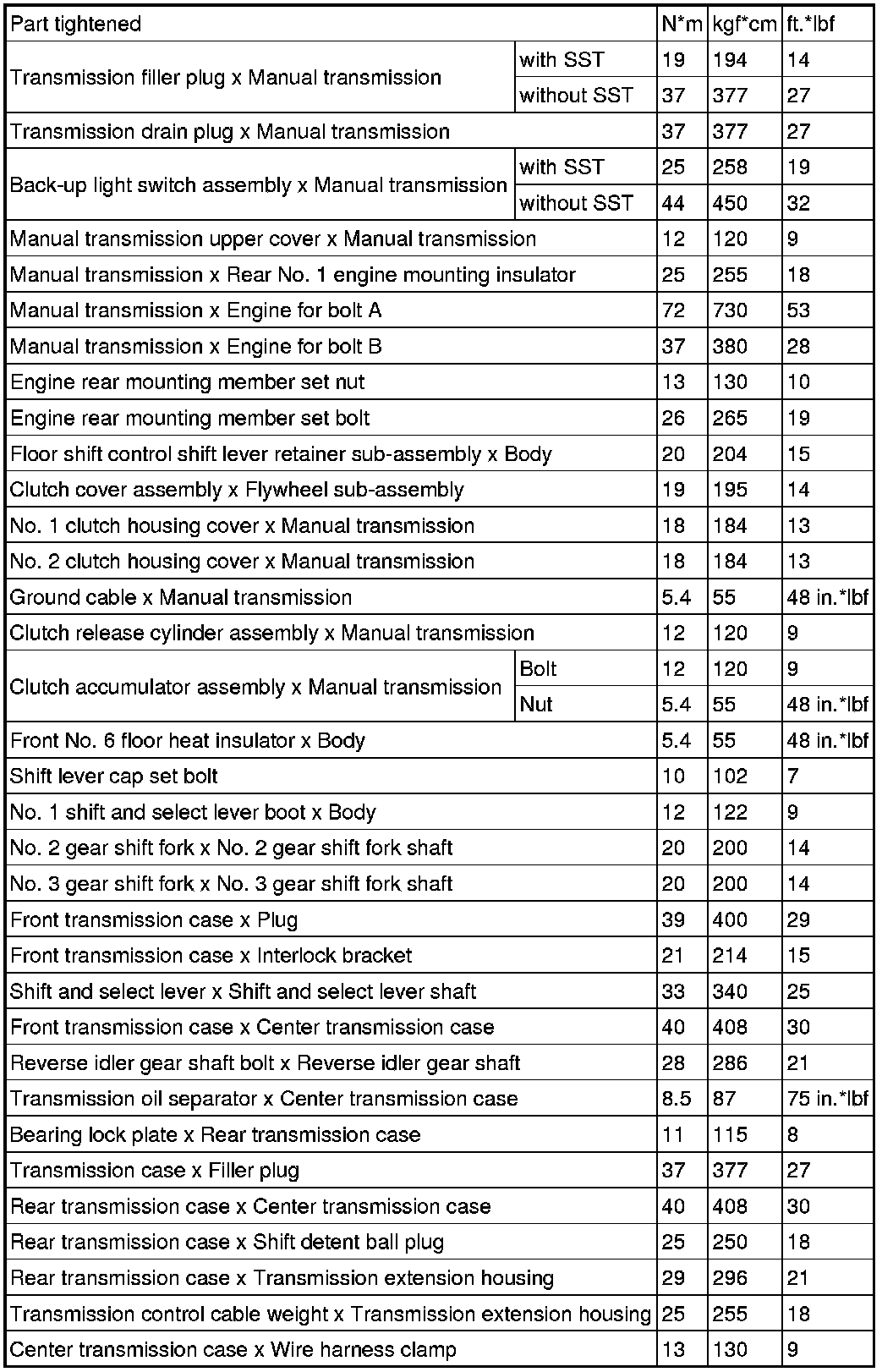 SPECIFICATIONS: RA62 MANUAL TRANSMISSION / TRANSAXLE: TORQUE SPECIFICATIONS