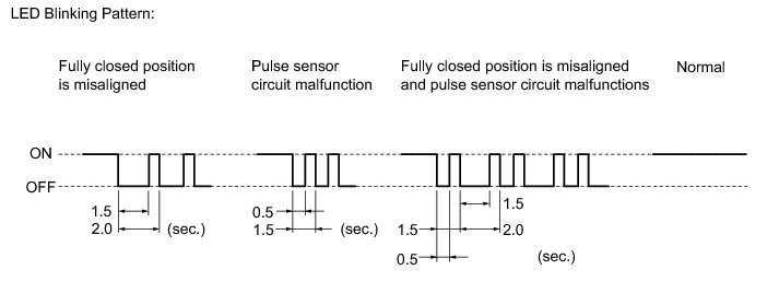 If there is a malfunction in the pulse sensor, manually operating the power window regulator master switch assembly or power window regulator switch assembly will cause the power window regulator master switch assembly or power window regulator switch assembly LED illumination to blink. The LED illumination continues to blink for 45 seconds or until the engine switch is turned off. After 45 seconds, the power window regulator master switch assembly or power window regulator switch assembly LED illumination remains on.
