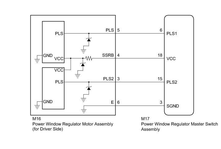 * If the pulse sensor on the power window regulator motor assembly (for driver side) malfunctions, the regulator will enter fail-safe mode, and the auto up and down function will not operate.