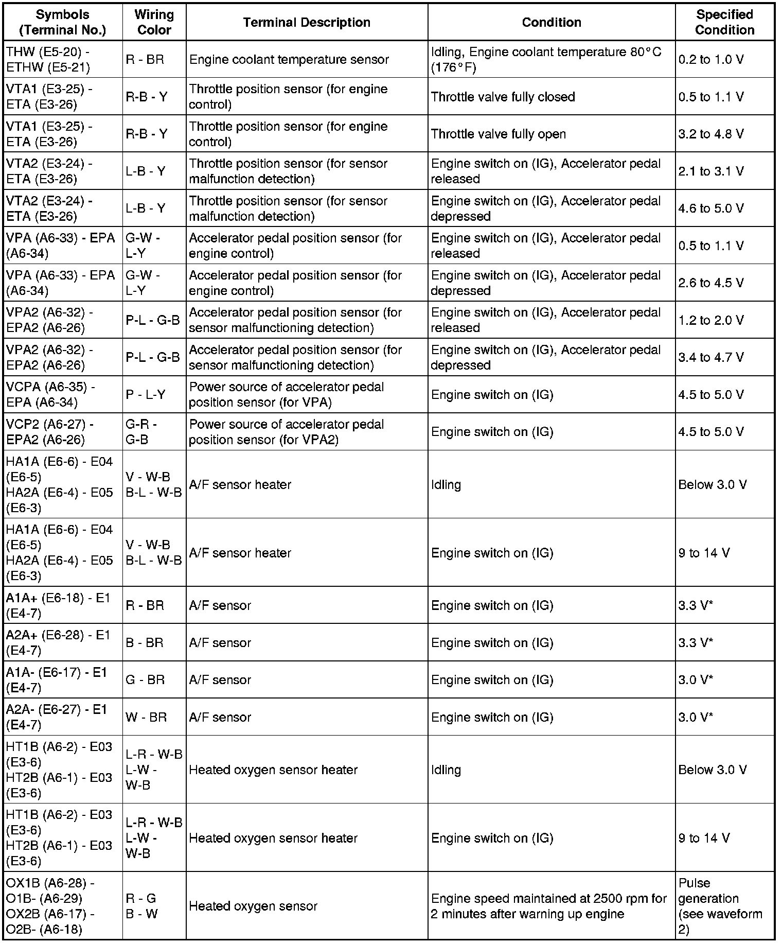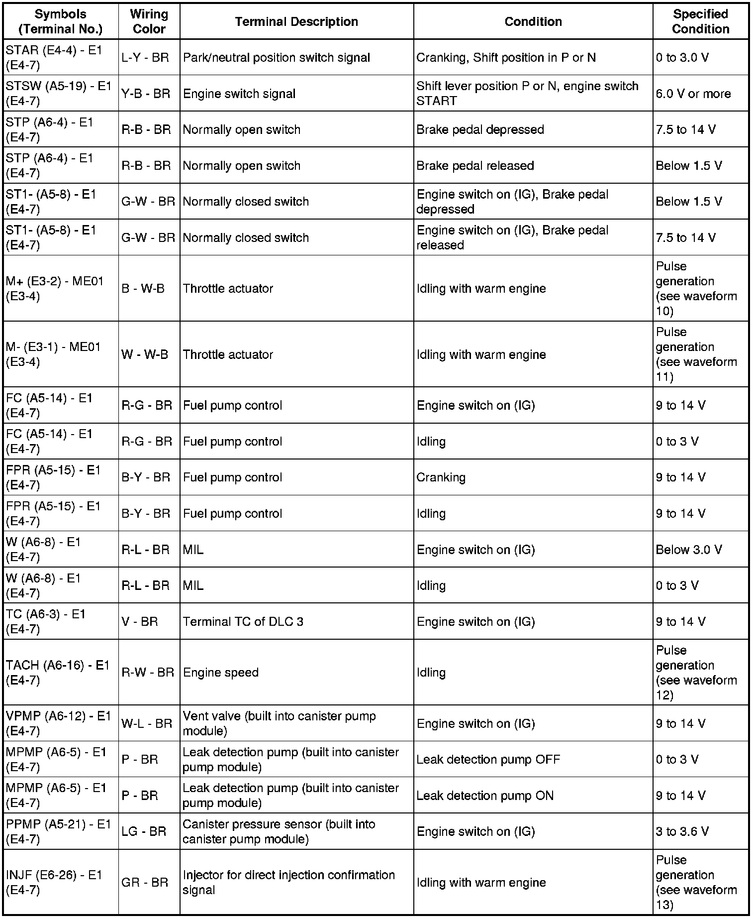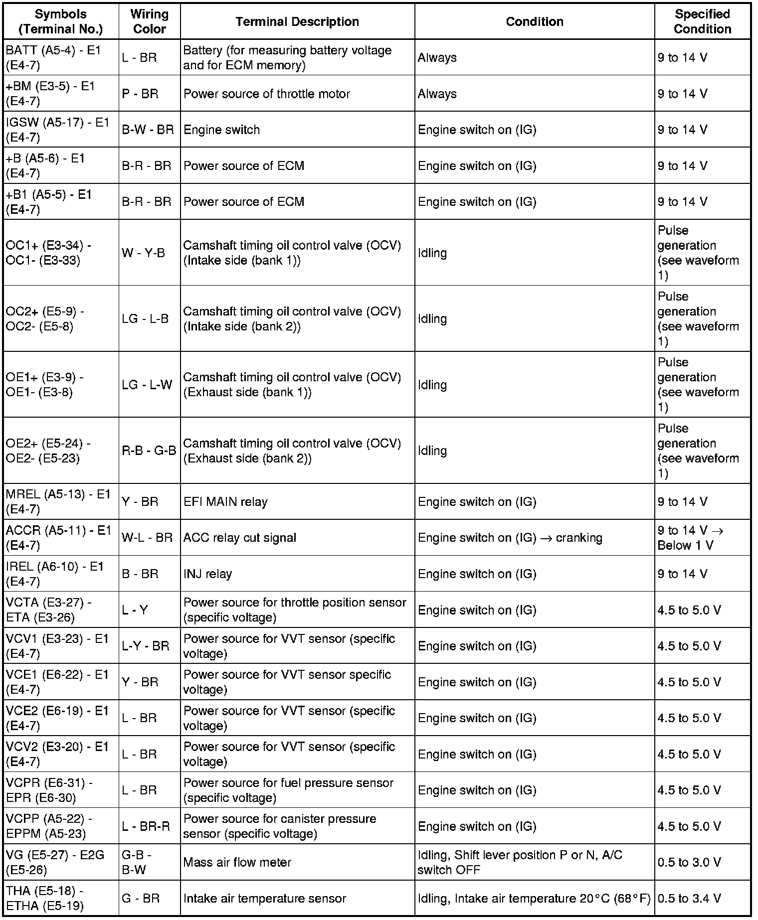 The standard normal voltage between each pair of the ECM terminals is shown in the table below. The appropriate conditions for checking each pair of the terminals are also indicated. The result of checks should be compared with the standard normal voltage for that pair of terminals, displayed in the Specified Condition column. The illustration above can be used as a reference to identify the ECM terminal locations.