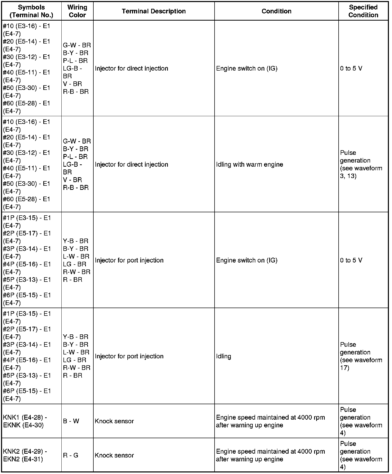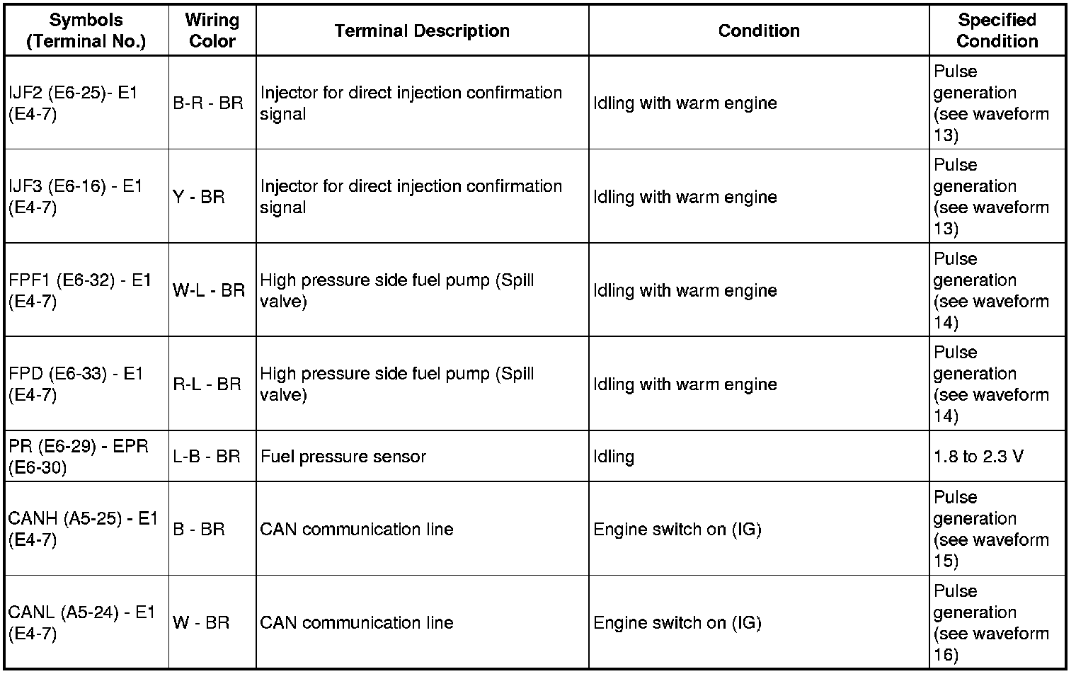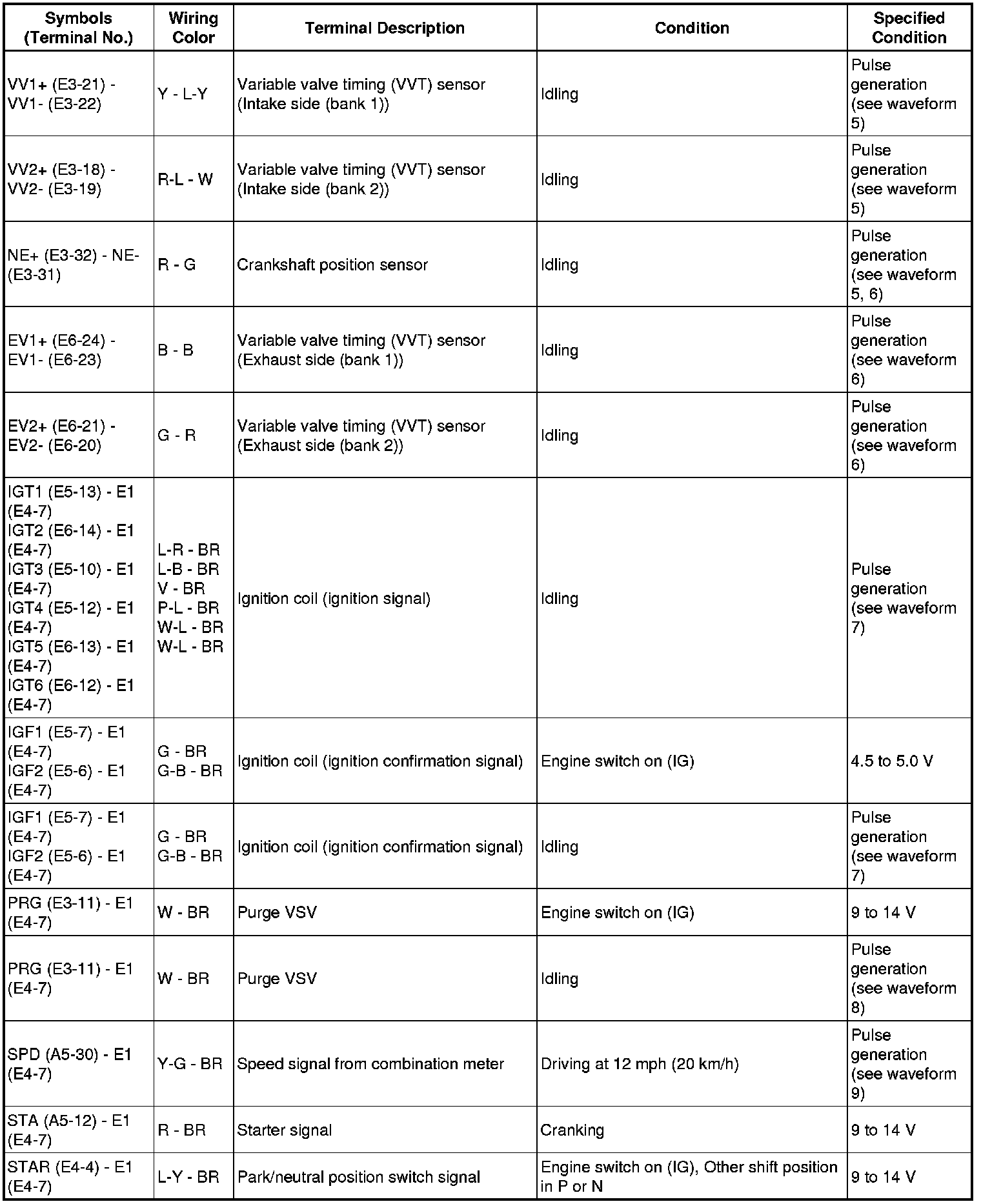 The standard normal voltage between each pair of the ECM terminals is shown in the table below. The appropriate conditions for checking each pair of the terminals are also indicated. The result of checks should be compared with the standard normal voltage for that pair of terminals, displayed in the Specified Condition column. The illustration above can be used as a reference to identify the ECM terminal locations.