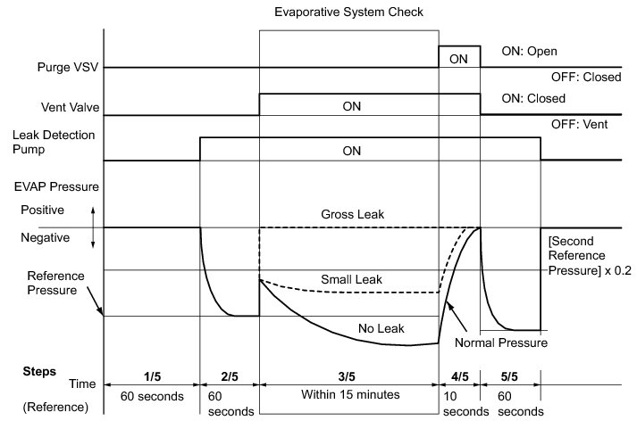 The electric leak detection pump creates negative pressure (vacuum) in the EVAP system and the pressure is measured. Finally, the ECM monitors for leaks from the EVAP system and malfunctions in both the canister pump module and purge VSV, based on the EVAP pressure.