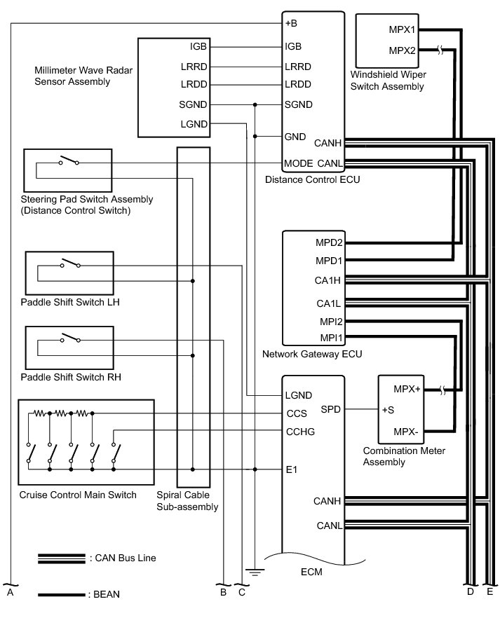 (d) The millimeter wave radar sensor and the distance control ECU control the system while the vehicle-to-vehicle distance control mode is operating, and send signals to each actuator and ECU.