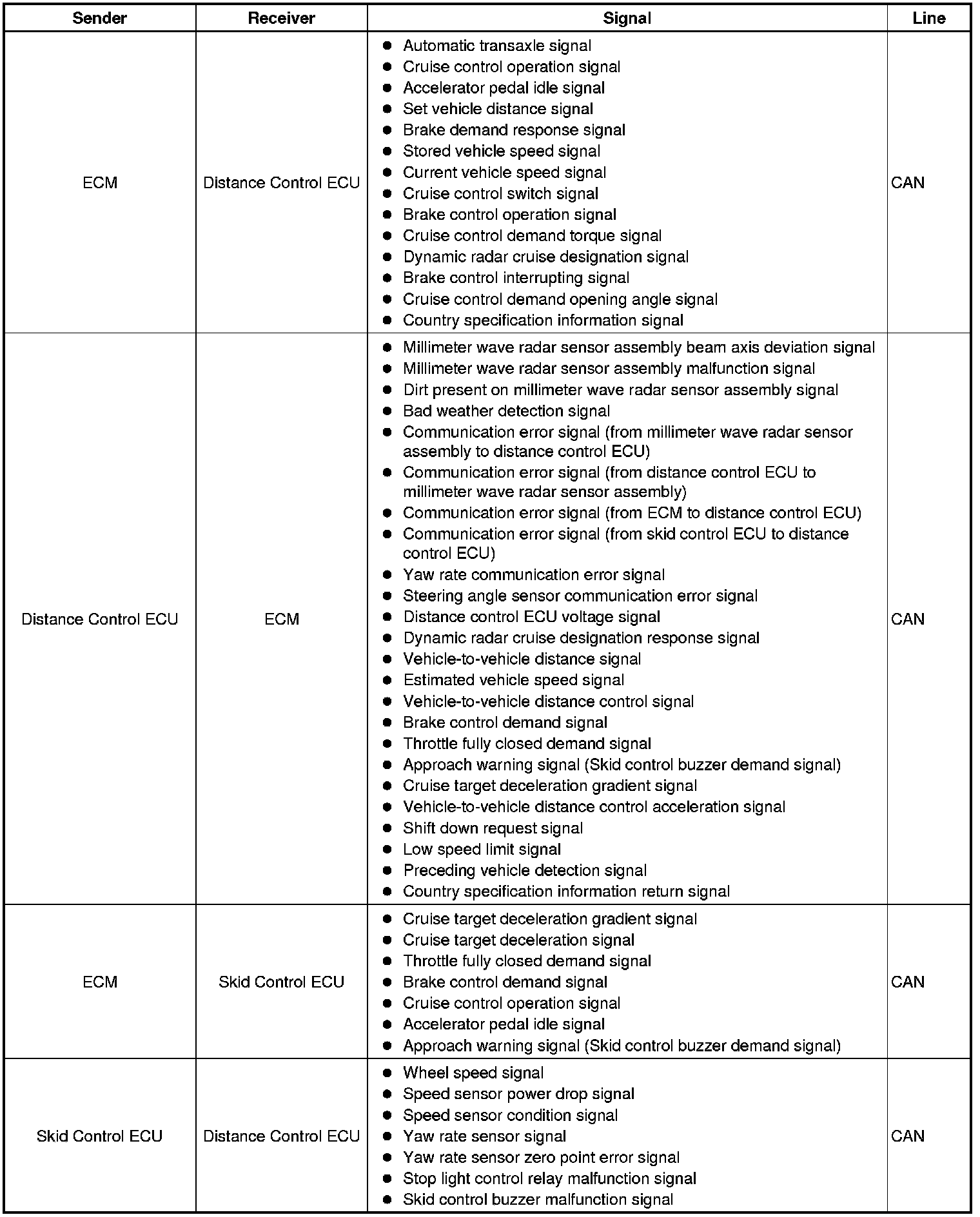 The distance control ECU determines the distance to the vehicle in front, relative speed, target decreasing speed, and deceleration rate. Based on these data, the ECU transmits a brake demand signal to the skid control ECU via the ECM.