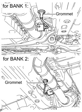 (b) Pass the heated oxygen sensor connectors through the floor panel and install the grommets.