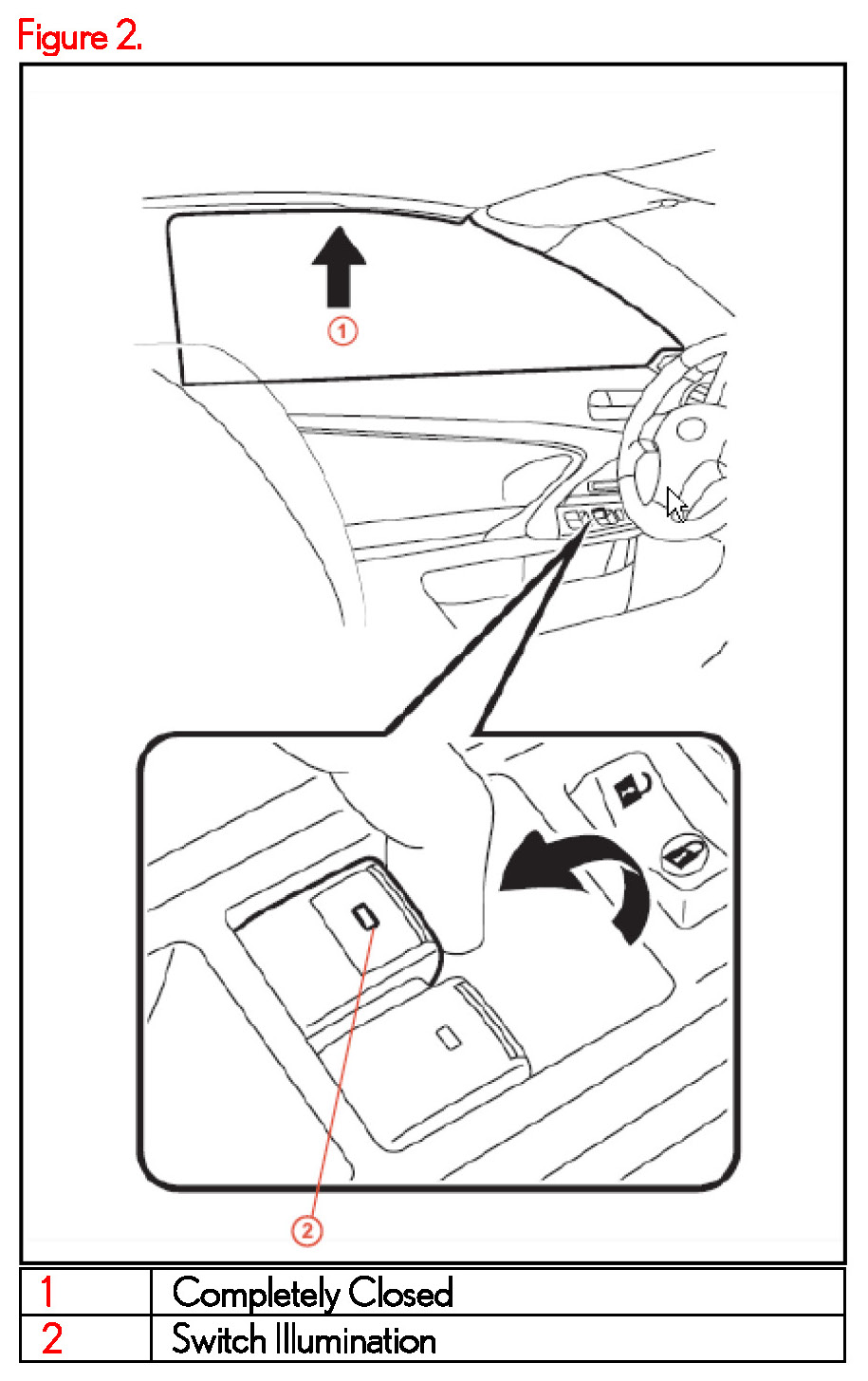 4. Pull "UP" the driver's door power window switch until the window closes, and hold it until the switch stops blinking and remains illuminated.