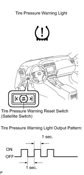 (b) Press and hold the tire pressure warning reset switch (satellite switch) for 3 seconds or more so that the tire pressure warning light blinks 3 times (1 second on, 1 second off).