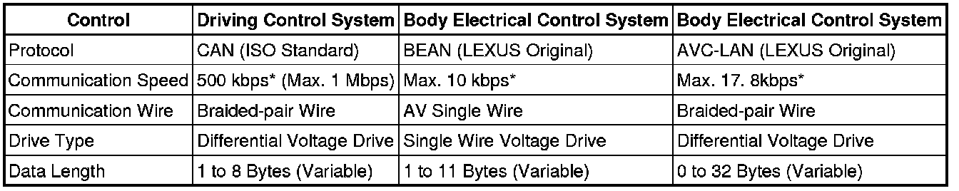 (1) The CAN, BEAN and AVC-LAN protocols have set guidelines for data. The guidelines include communication speed, type of communication wire, drive type and data length. These guidelines are established to facilitate ECU data communication.