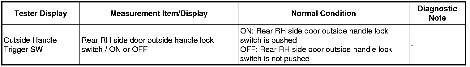 If the rear door RH entry lock function does not operate but the entry unlock operation operates, the communication line between the vehicle and electrical key transmitter is normal. Either of the following may have occurred: 1) the entry lock switch is malfunctioning; or 2) the rear door ECU RH receives the entry lock switch ON signal, but is unable to send the signal to the certification ECU through CAN communication.