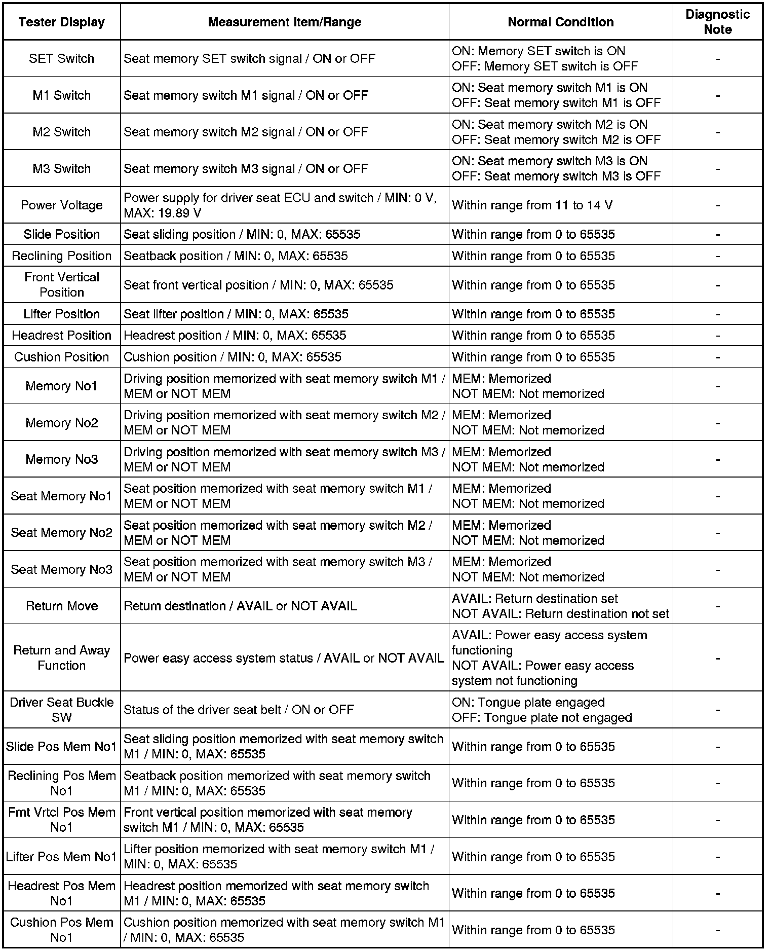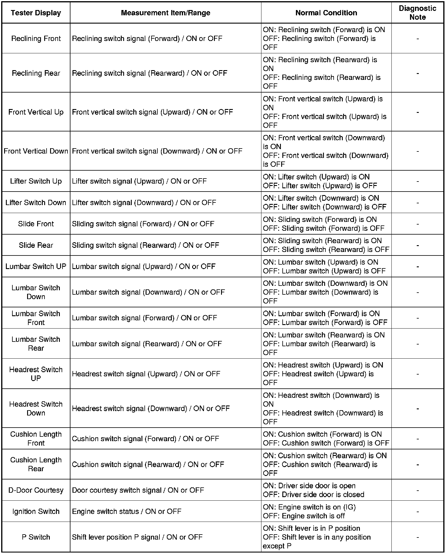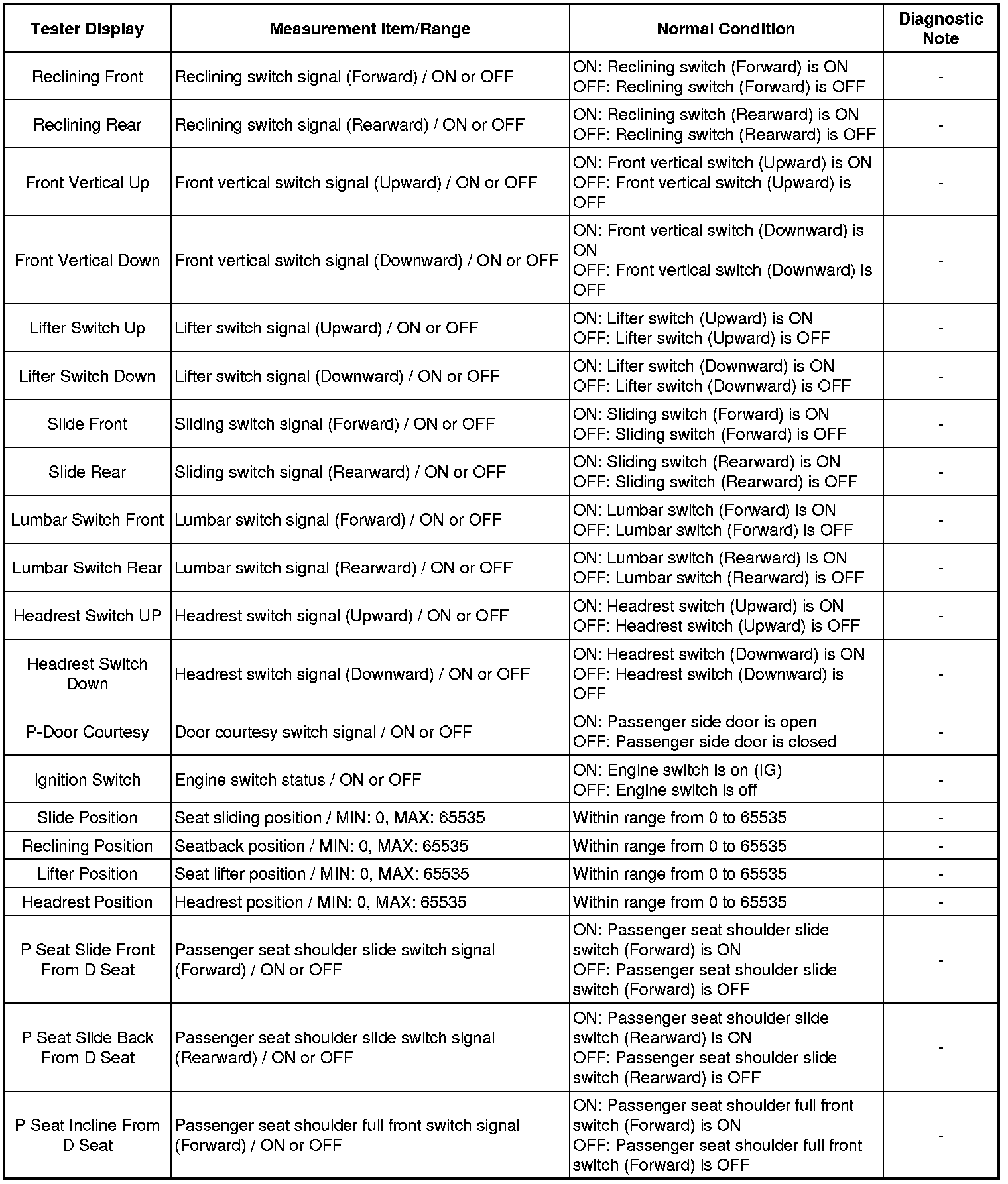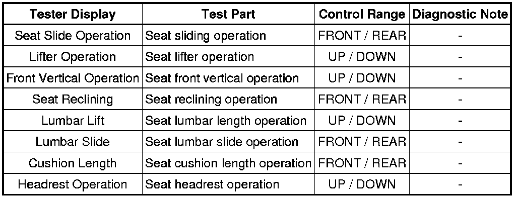 SEAT: FRONT POWER SEAT CONTROL SYSTEM: DATA LIST / ACTIVE TEST