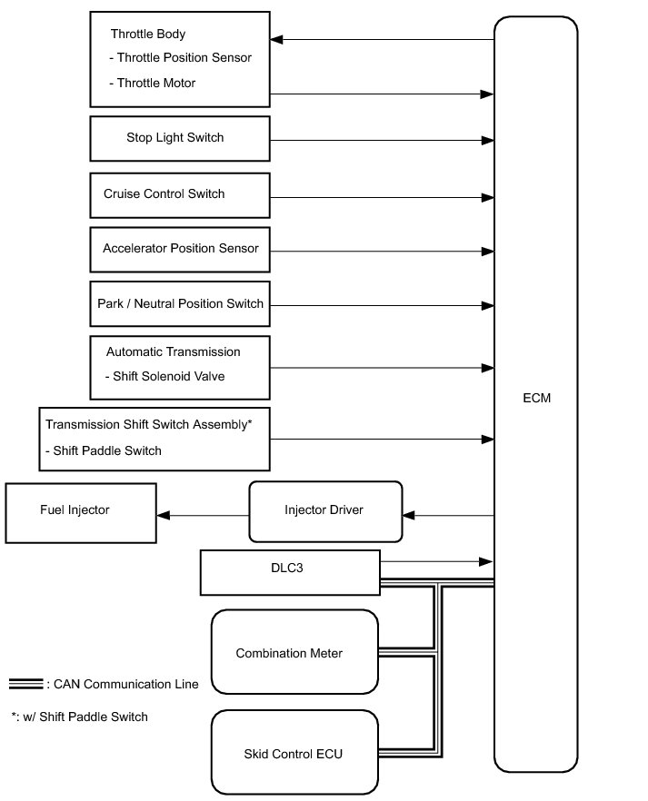 The ECM cancels cruise control when it detects that the transmission is changed from 4th gear to 3rd, 2nd or 1st gear with the shift paddle switch while the shift lever is in D or M.