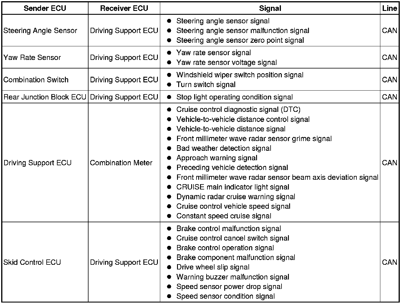 The driving support ECU determines the distance to the vehicle in front, relative speed, target decreasing speed and deceleration rate. Based on the data, the ECU may transmit a brake demand signal to the skid control ECU.
