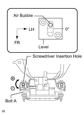 * If "LEFT SIDE: 1.0°" is displayed, the divergence is 1.0° in the left direction. Turn bolt B approximately 14.8 turns to the negative (-) side.