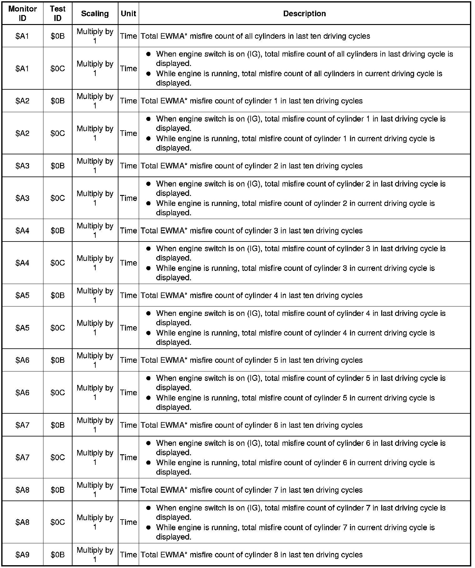 *: EWMA (Exponential Weighted Moving Average) misfire counts for last 10 driving cycles (calculated) Calculation: 0.1 x (current counts) + 0.9 x (previous average) Initial value for (previous average) = 0