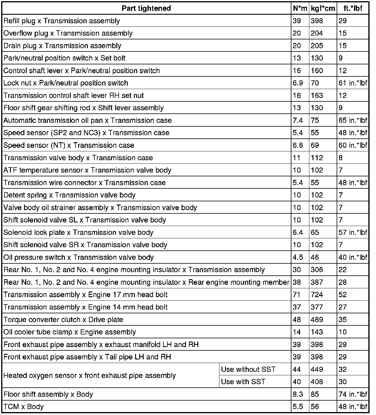 SERVICE SPECIFICATIONS: AA80F AUTOMATIC TRANSMISSION: TORQUE SPECIFICATIONS