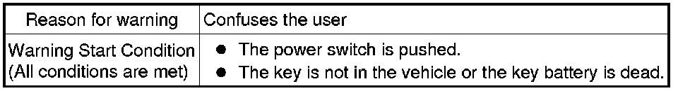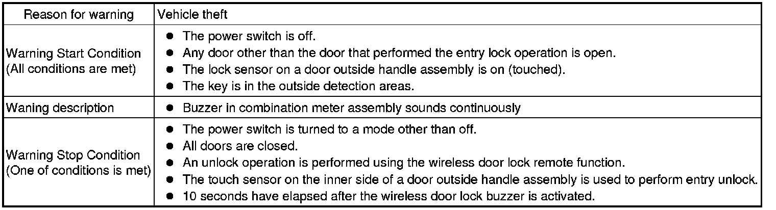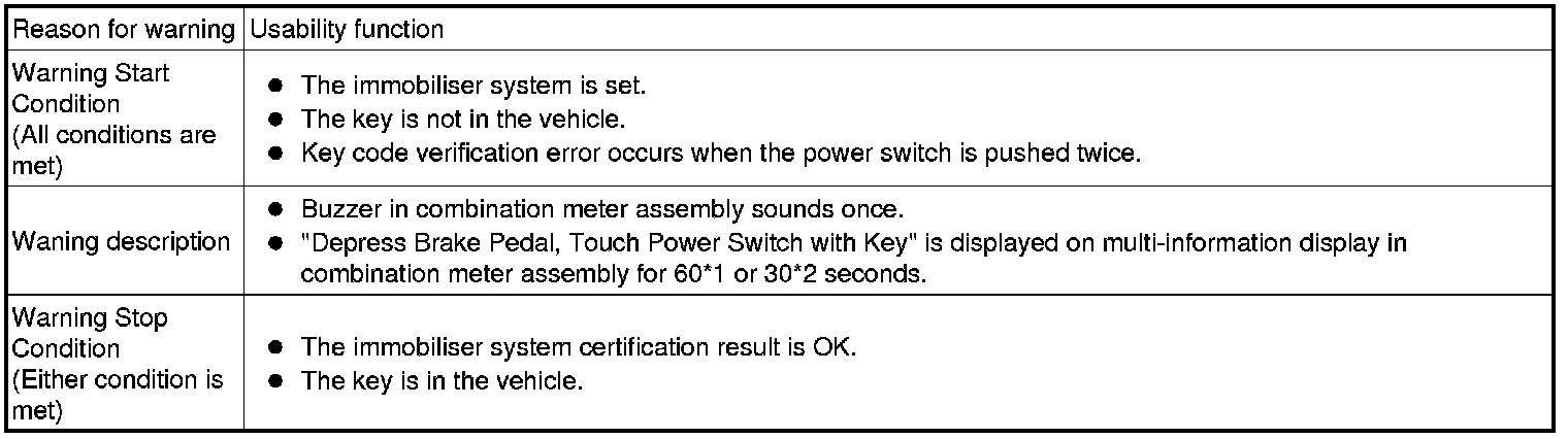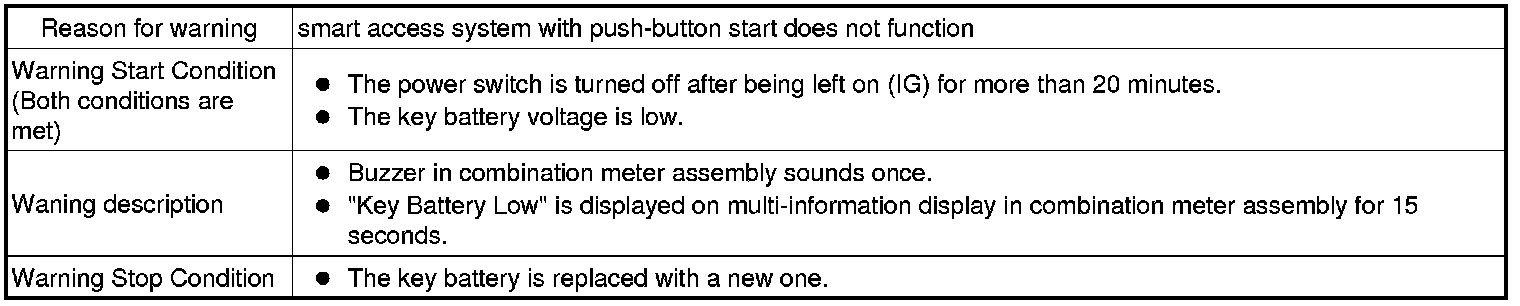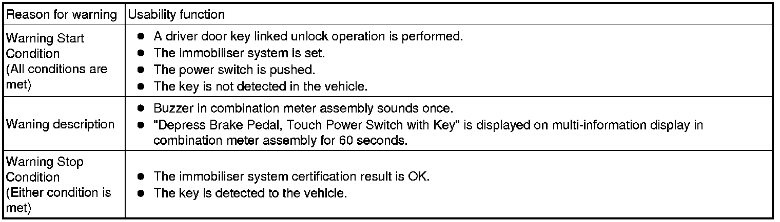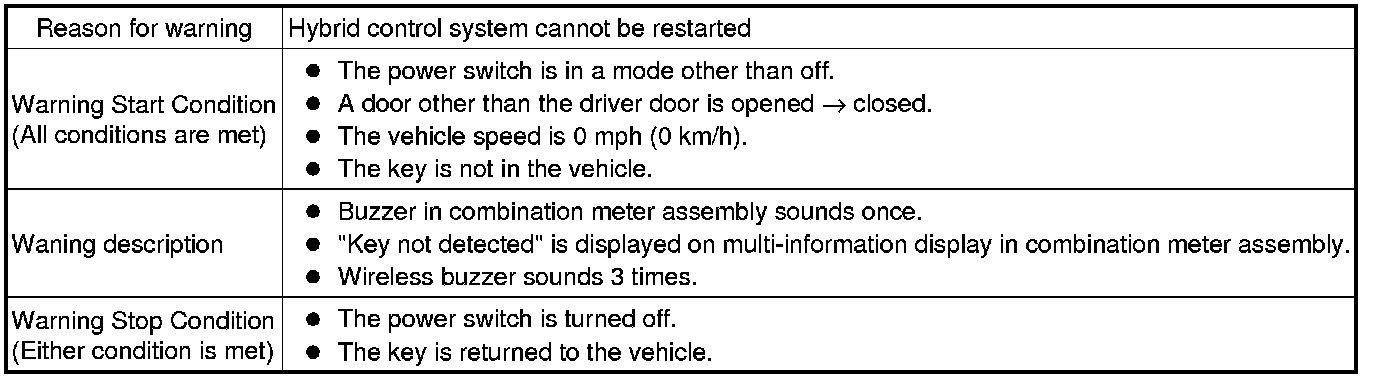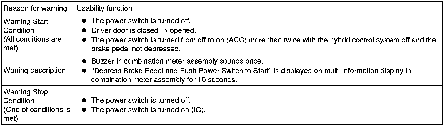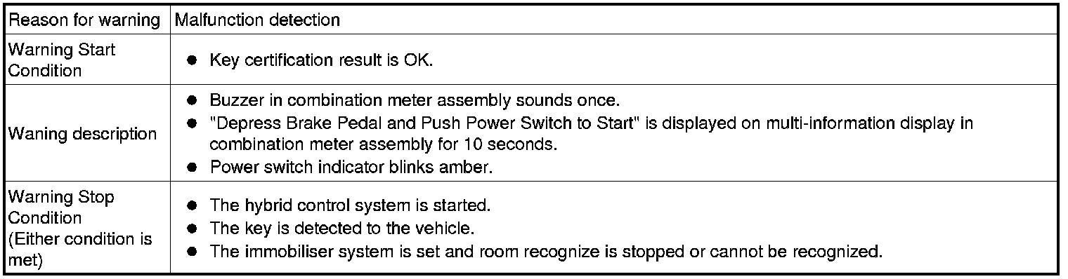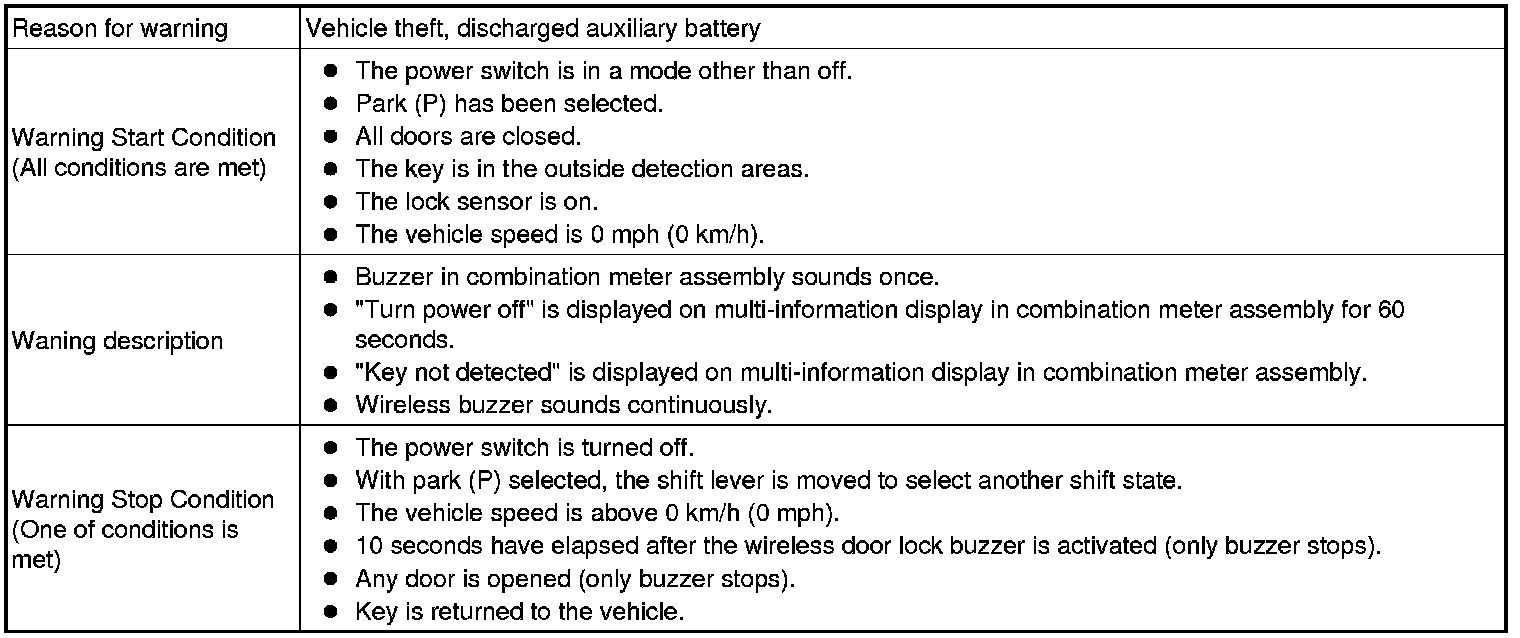 (1) When any of the situations below occur, the smart access system with push-button start causes the certification ECU (smart key ECU assembly) to sound a buzzer in the combination meter assembly and the wireless door lock buzzer, a message to appear on the multi-information display, and the power switch illumination to operate in order to alert the driver.