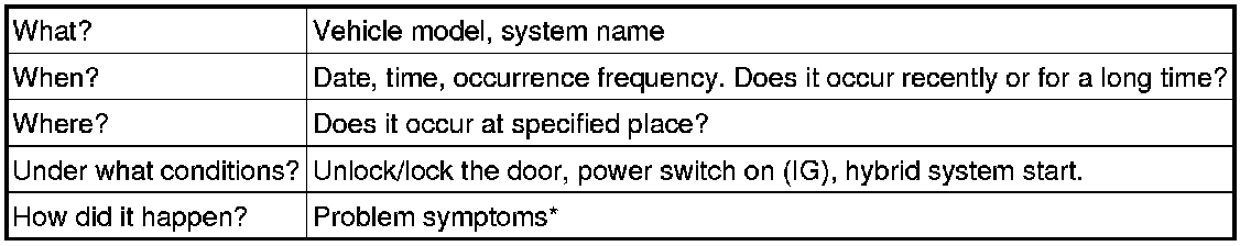 * *: Be sure to ask the customer in detail about the following points concerning the vehicle operating conditions, environment and problem, and then check for DTCs.
