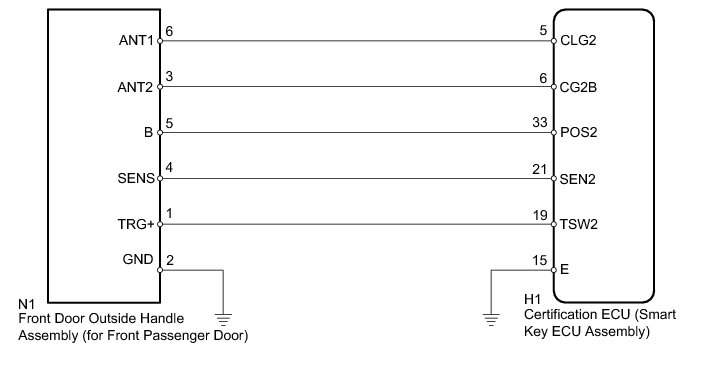 If the entry lock and unlock functions do not operate for the front passenger door only, the request code may not be being transmitted from the front passenger door or the front door outside handle assembly (for front passenger door) (touch sensor) may be malfunctioning. If the entry functions for other doors operate properly, communication between the key and door control receiver is normal. In this case, there may be a problem with request code transmission (communication between the certification ECU (smart key ECU assembly) and front door outside handle assembly (for front passenger door) [front passenger door electrical key antenna]), or there may be wave interference.