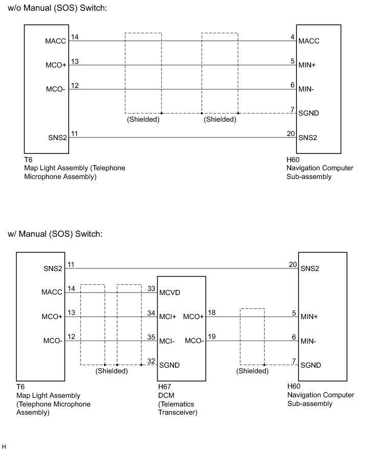* Using this circuit, the navigation computer sub-assembly sends power to the map light assembly (telephone microphone assembly), and the map light assembly sends microphone signals to the navigation computer sub-assembly (w/o manual (SOS) switch).