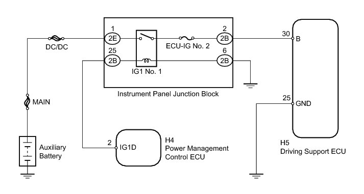 * The power management control ECU sends current to the IG1 No. 1 relay. This closes the contact points in the relay so that power is supplied to the driving support ECU assembly +B terminal.