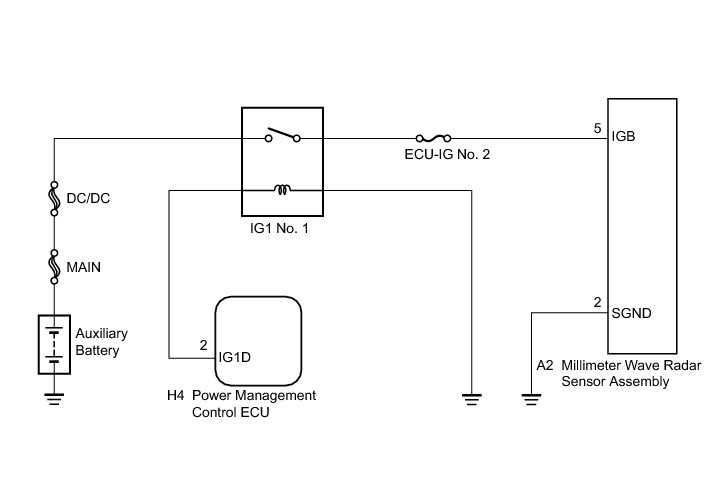 When the power switch is turned on (IG), auxiliary battery voltage is applied to terminal IGB of the millimeter wave radar sensor assembly.