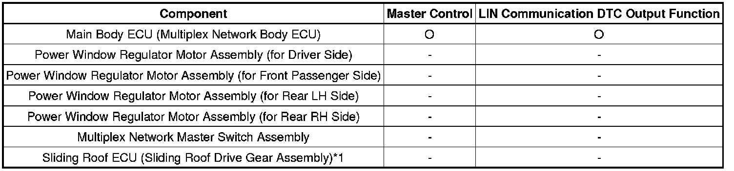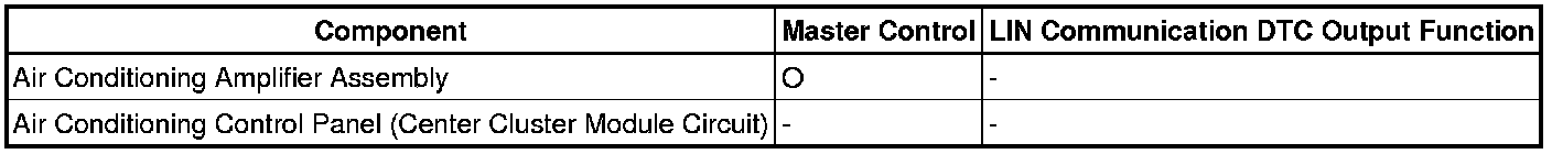 The LIN communication system is used for communication between the components in the tables below. If communication cannot be performed through LIN communication because of an open in the communication lines or other reasons, the master control ECU of the relevant system will store a DTC. Refer to the table below about the communication bus lines and connected components.