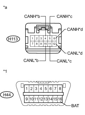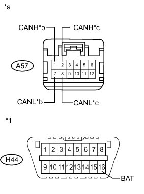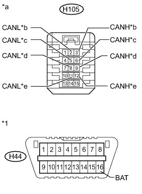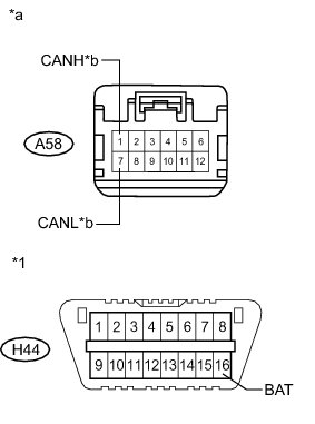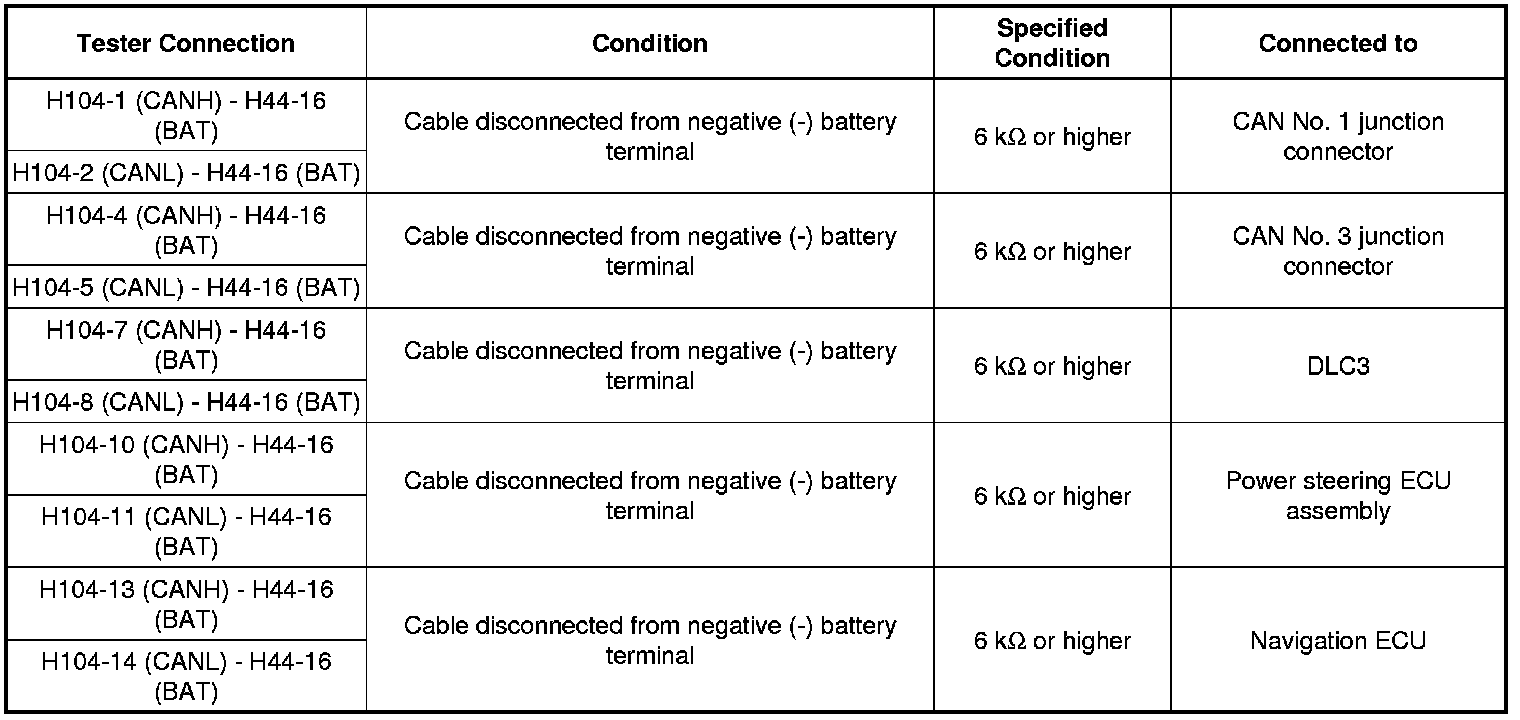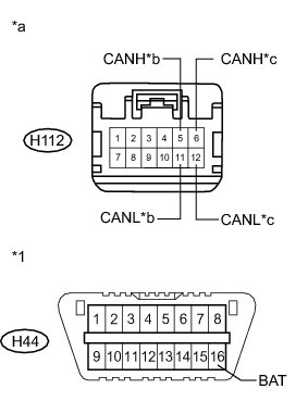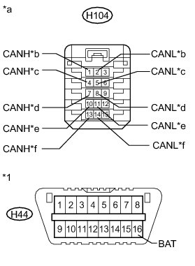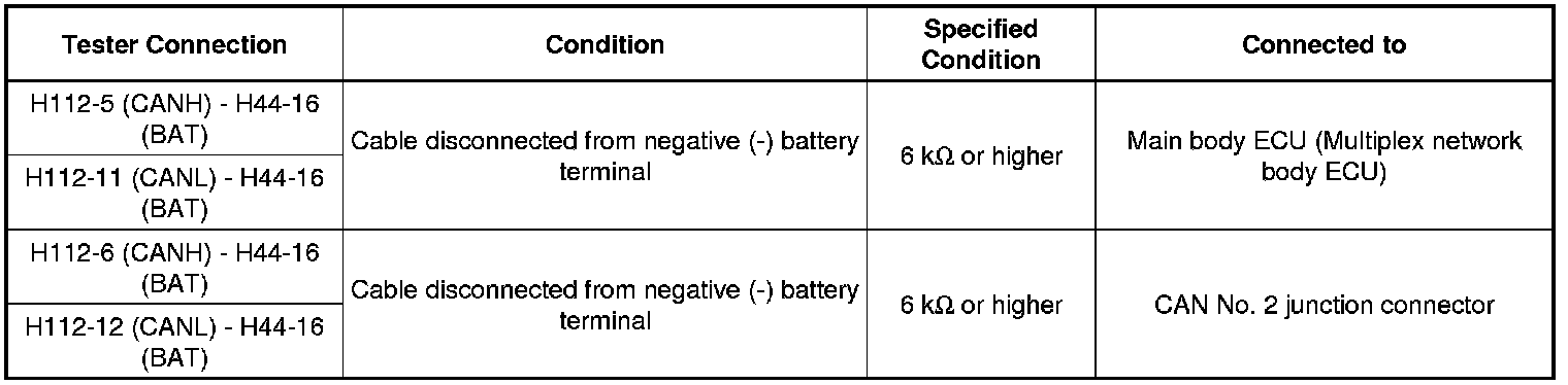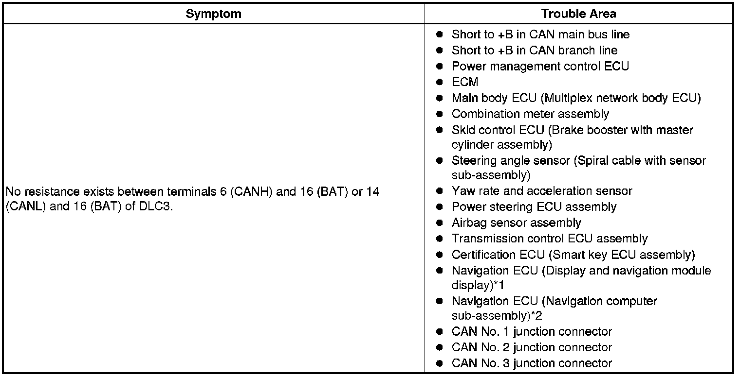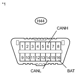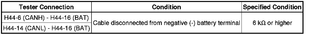 There may be a short circuit between one of the CAN bus lines and +B when no resistance exists between terminals 6 (CANH) and 16 (BAT) or 14 (CANL) and 16 (BAT) of the DLC3.