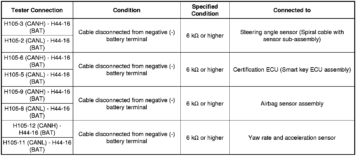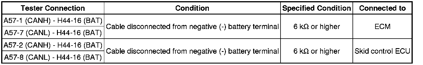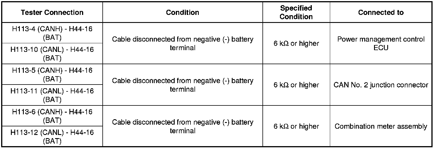 If the ECU or sensor has multiple connectors, disconnect the connector that includes the CAN bus lines. To determine the ECU or sensor that is connected to the shorted bus line, refer to the terminals of ECU tables CAN Communication System.