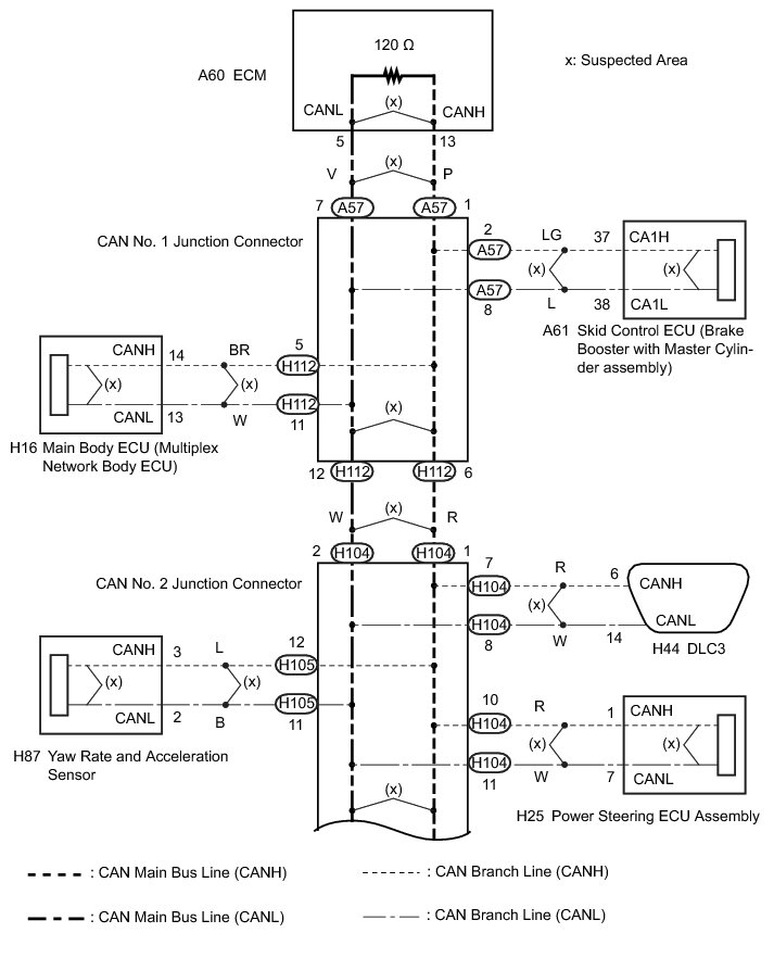 There may be a short circuit between the V1 bus main lines and/or CAN branch lines when the resistance between terminals 6 (CANH) and 14 (CANL) of the DLC3 is below 54 Ohms.