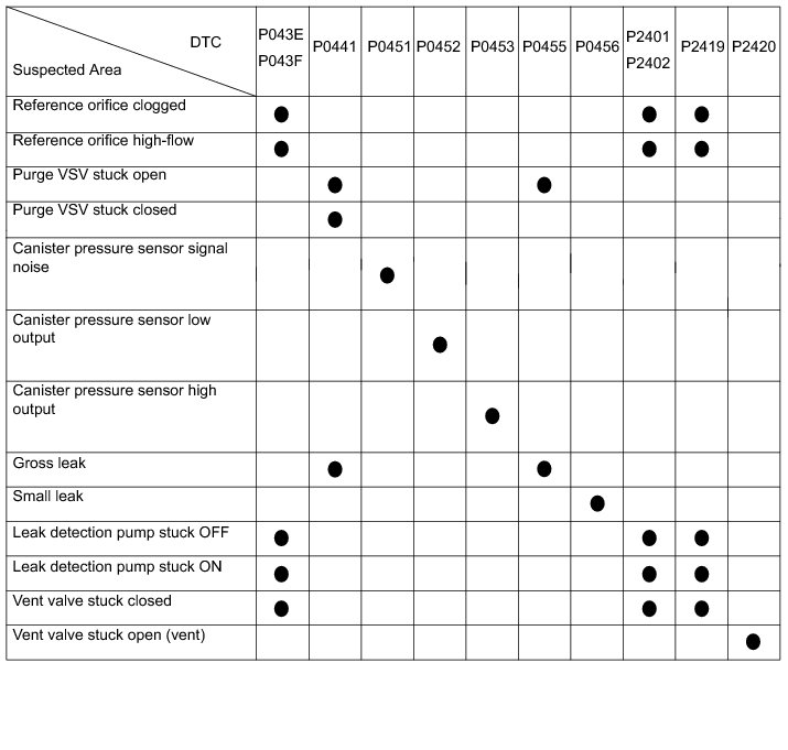If any EVAP system DTCs are stored, the malfunctioning area can be determined using the table below.
