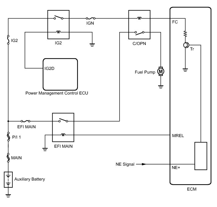 While the NE signal is generated (engine running), the ECM keeps Tr on (circuit opening relay on) and the fuel pump also keeps operating.