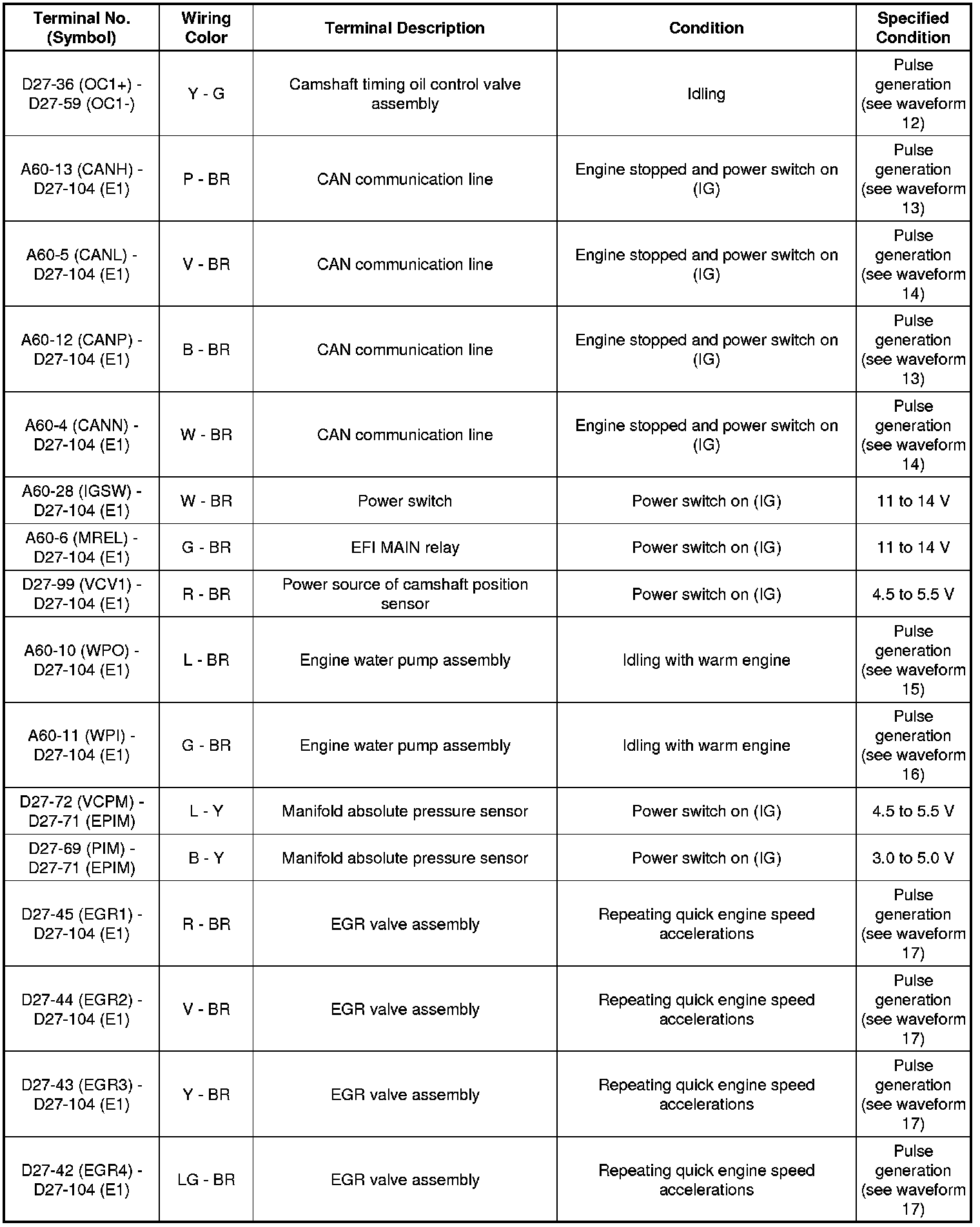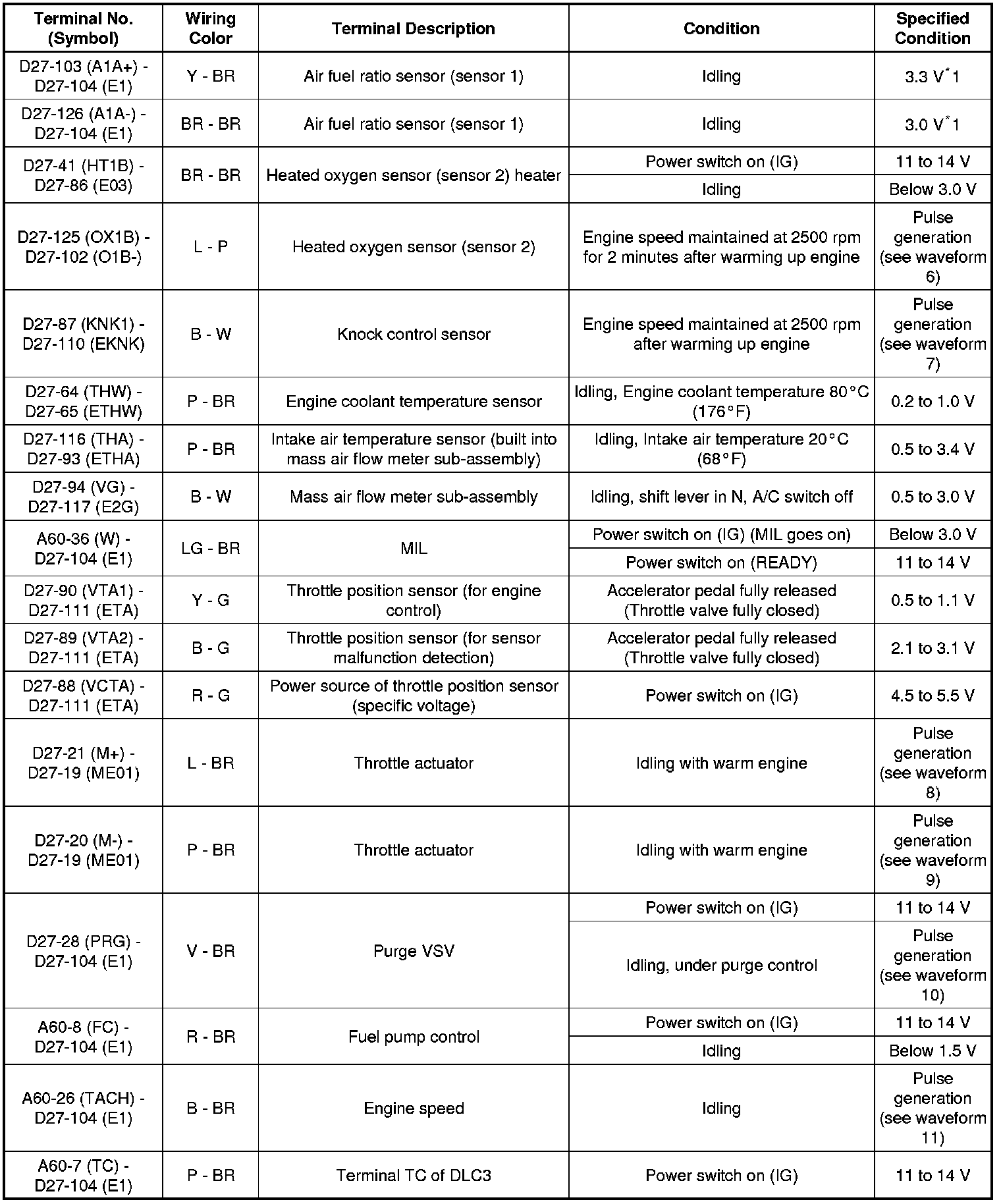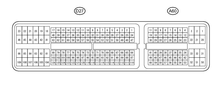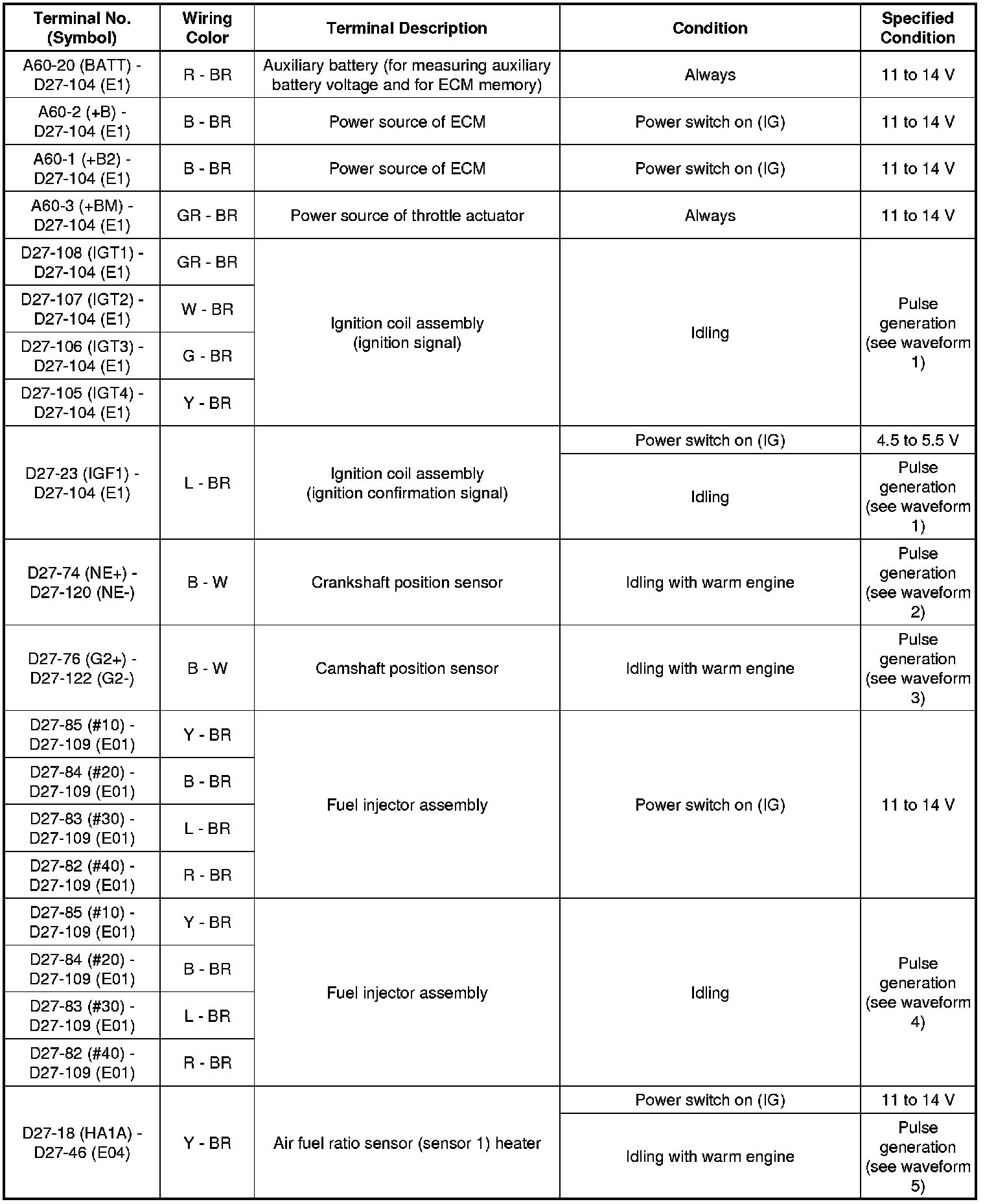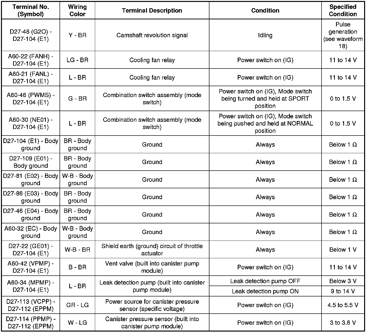 The standard normal voltage between each pair of the ECM terminals is shown in the table below. The appropriate conditions for checking each pair of the terminals are also indicated. The result of checks should be compared with the standard normal voltage for that pair of the terminals, and displayed in the "Specified Condition" column. The illustration above can be used as a reference to identify the ECM terminal locations.