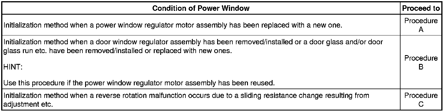 When the auxiliary battery is replaced, it is not necessary to initialize the power window regulator motor assembly.