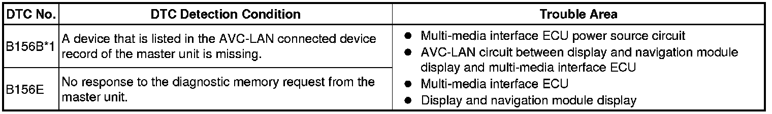 When an AVC-LAN communication error occurs between the display and navigation module display and the multi-media interface ECU, these DTCs will be stored.