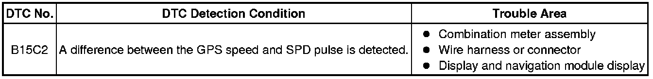 The display and navigation module display stores this DTC when the difference between the speed information that the GPS antenna receives and the SPD pulse received from the combination meter assembly becomes large.