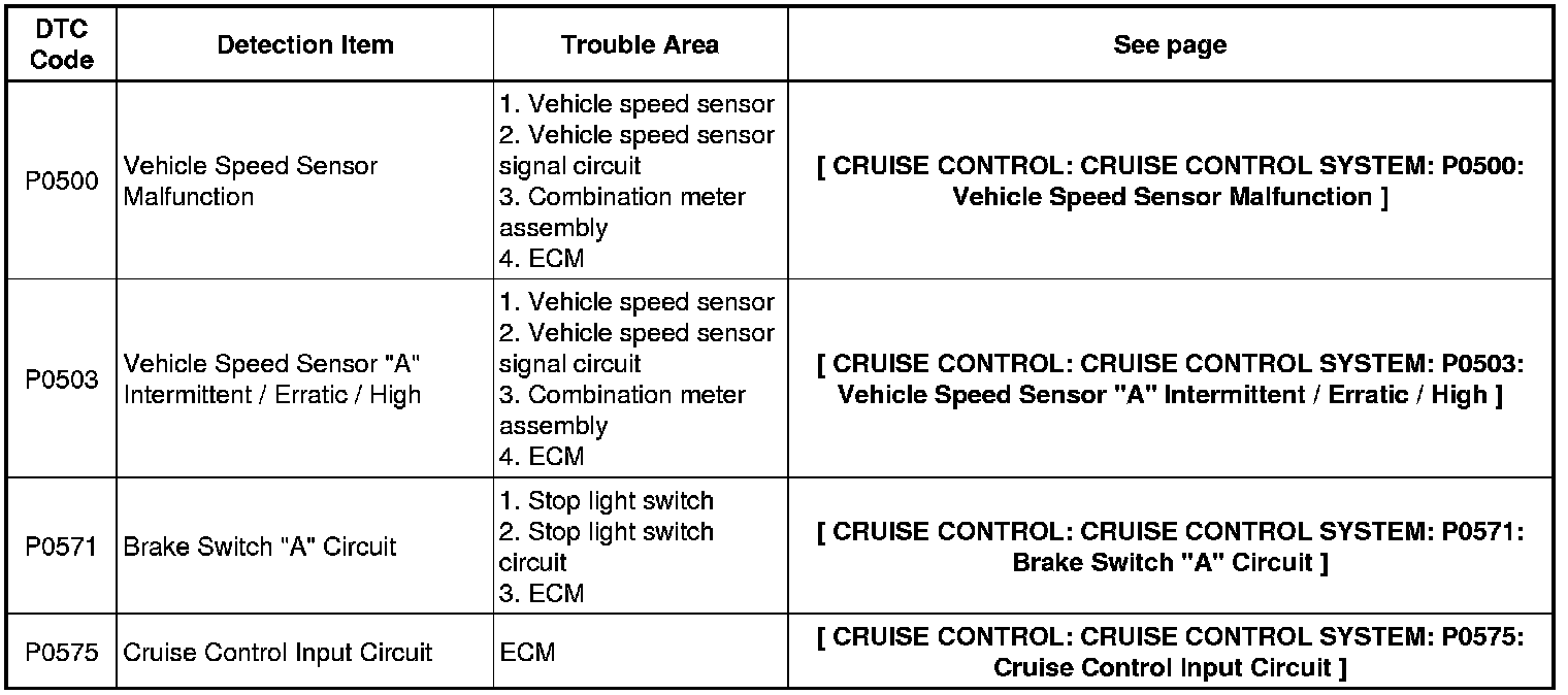 CRUISE CONTROL: CRUISE CONTROL SYSTEM: DIAGNOSTIC TROUBLE CODE CHART