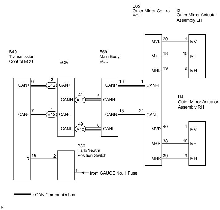 After the transmission control ECU receives a reverse signal from the park/neutral position switch, transmission control ECU the sends a reverse signal to the outer mirror control ECU via the CAN communication systems. The outer mirror control ECU activates the mirror motor in response to the reverse signal.
