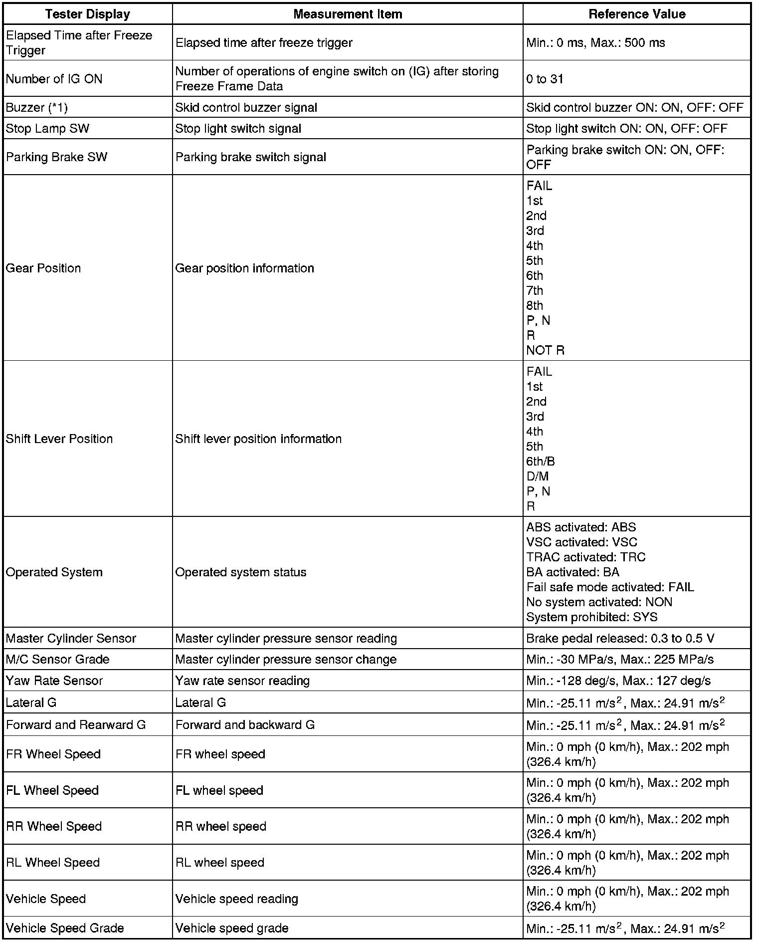 * Freeze Frame Data at the time the ABS operates: