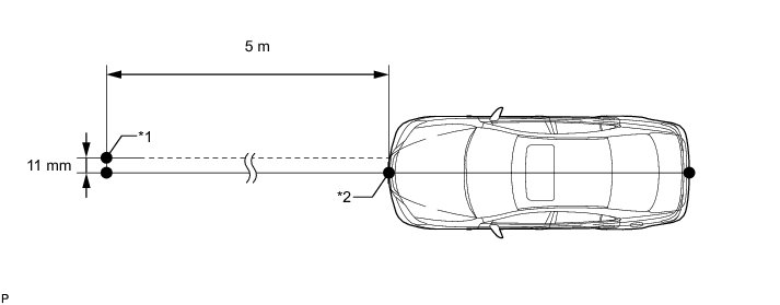 (2) Set one end of the 10 m (32.82 ft.) string on the vehicle's rear center point. Run the string over the vehicle's front center point to a position 5 m (16.41 ft.) beyond the vehicle's front center point, as shown in the illustration. Mark the 5 m (16.41 ft.) position.