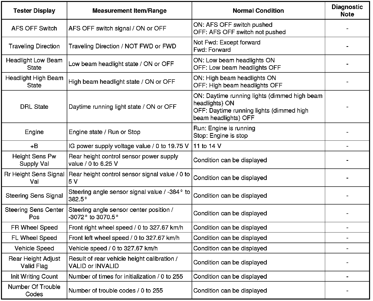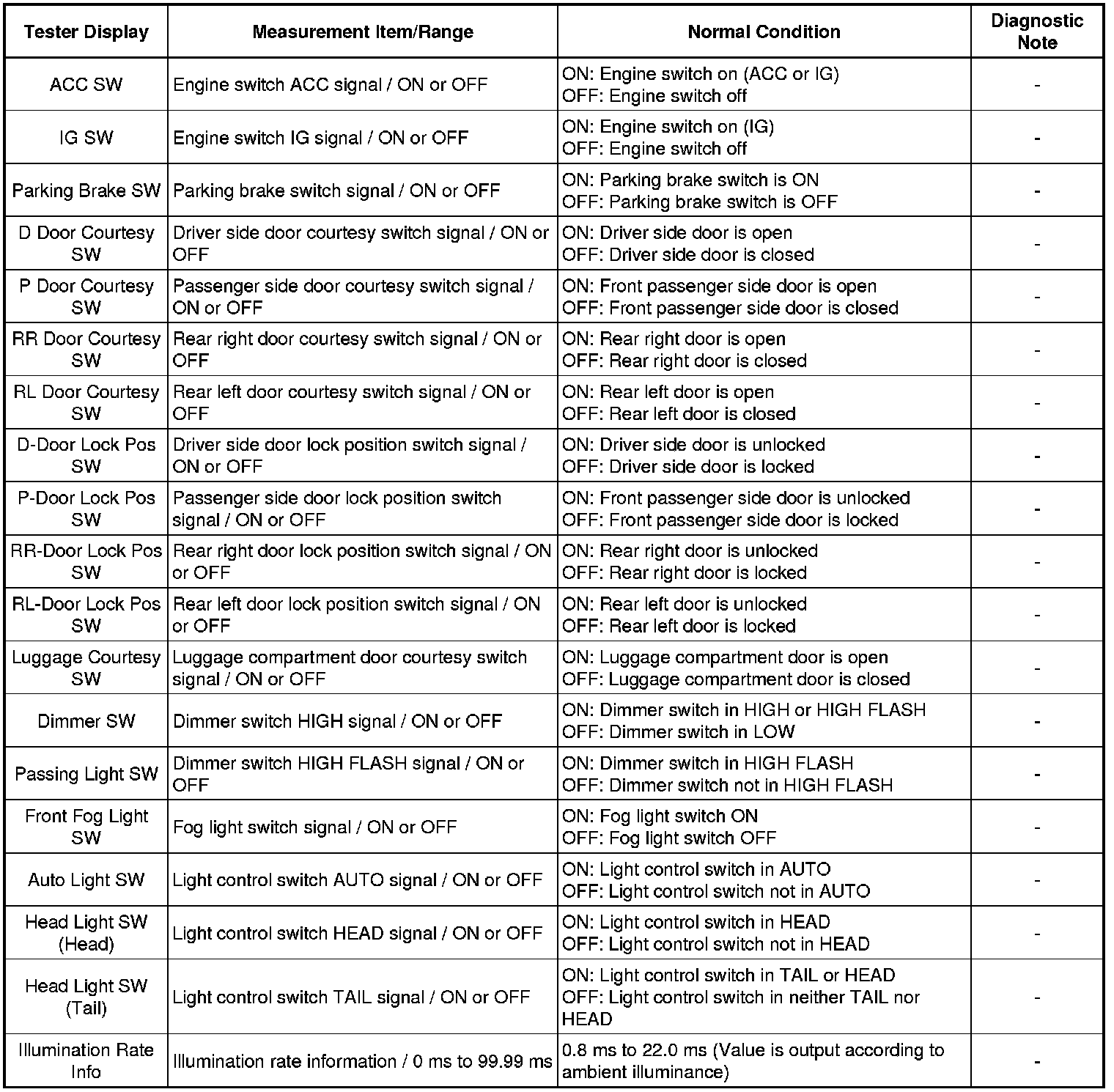 Using Techstream to read the Data List allows the values or states of switches, sensors, actuator and other items to be read without removing any parts. This non-intrusive inspection can be very useful because intermittent conditions or signals may be discovered before parts or wiring is disturbed. Reading the Data List information early in troubleshooting is one way to save diagnostic time.