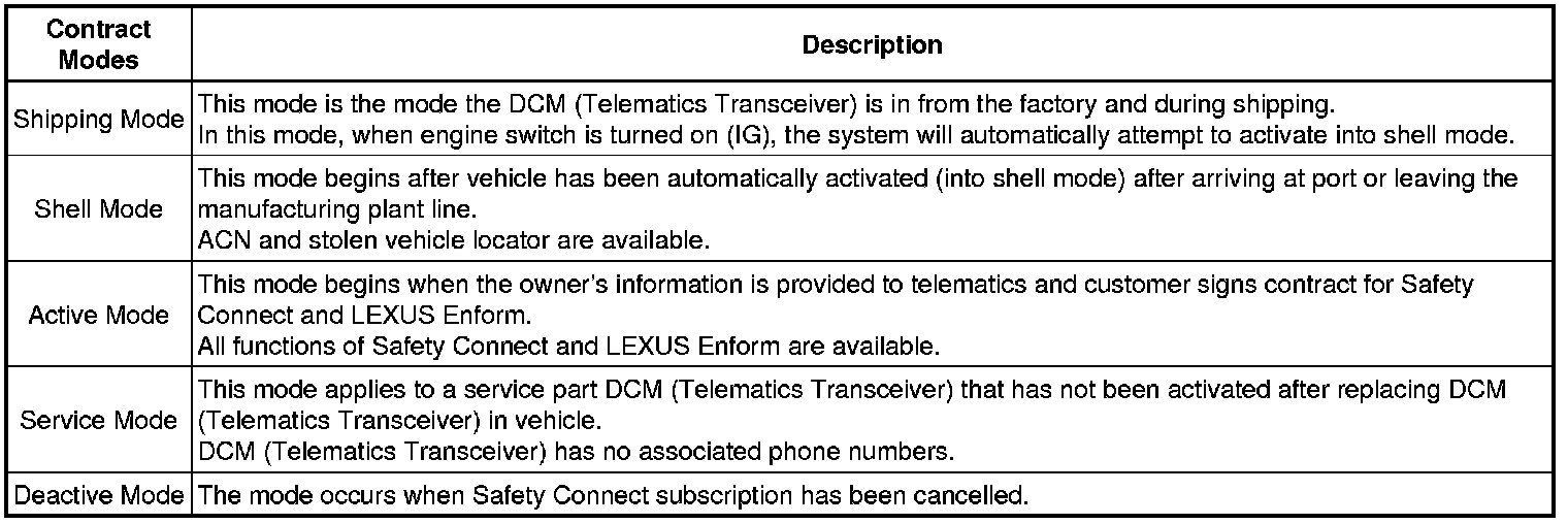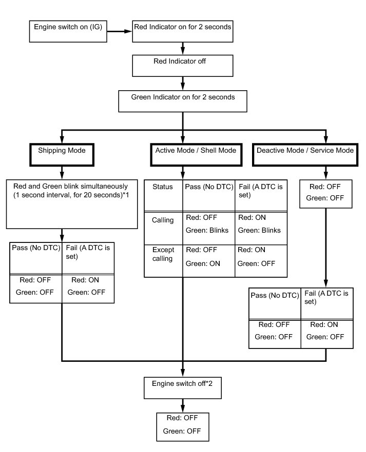 Every time after the engine switch is turned on (IG), the DCM (Telematics Transceiver) will enter into a self check mode. The manual (SOS) switch red indicator will illuminate for 2 seconds and then turn off and then the manual (SOS) switch green indicator will illuminate and will stay on throughout normal operation. The following chart indicates the possible scenarios.
