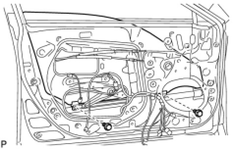 (b) Pass the front door lock remote control cable and rear door inside locking cable through a new front door service hole cover.