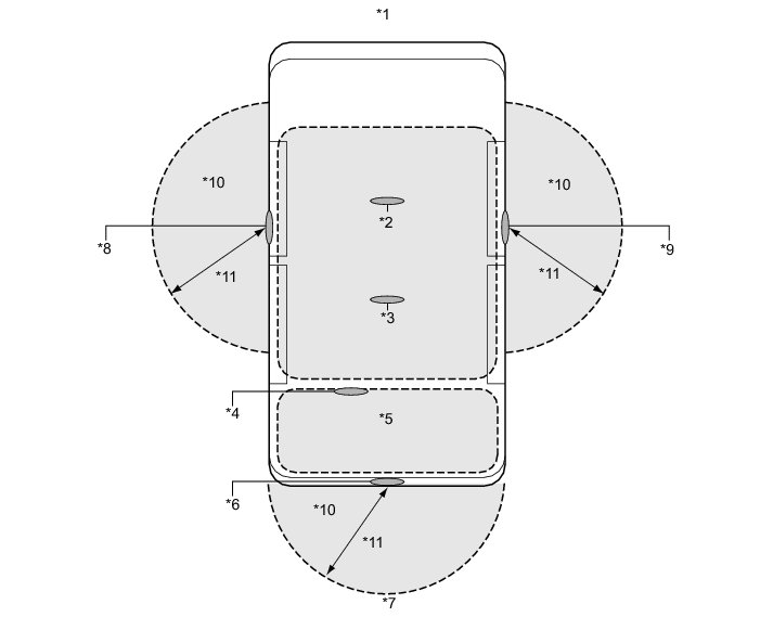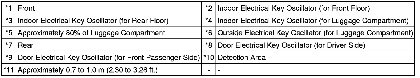 * The detection area of the indoor electrical key oscillators (for front floor and rear floor) is formed when any door is opened or closed, when the hybrid control system starts, when a warning is activated, or when a lock sensor on a door outside handle assembly or the lock switch on the luggage compartment door opener outer switch is on.