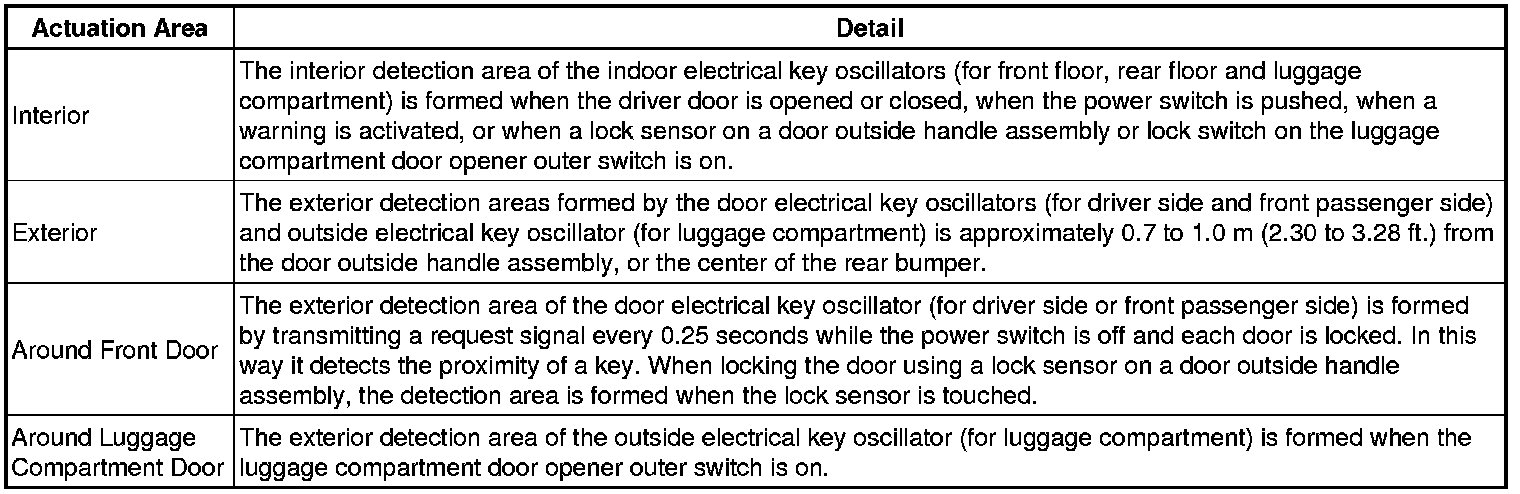Each oscillator transmits the request signal received from the certification ECU (smart key ECU assembly), and forms a key detection area to detect the presence of a key. The detection area formed by door electrical key oscillator (for driver side and front passenger side) and outside electrical key oscillator (for luggage compartment) is approximately 0.7 to 1.0 m (2.30 to 3.28 ft.) from the door outside handle assembly of door (for driver side, front passenger side) or the center of the rear bumper.