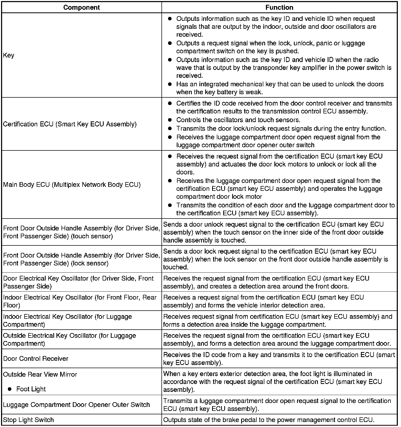 (1) When the door is locked by the lock knob in the inside door handle while the key is still in the vehicle, the main body ECU (multiplex network body ECU) receives this signal and transmits the door condition signal to the certification ECU (smart key ECU assembly).