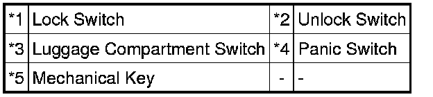 * The transmitter function for the wireless door lock control has a lock switch, unlock switch, panic switch and luggage compartment switch.